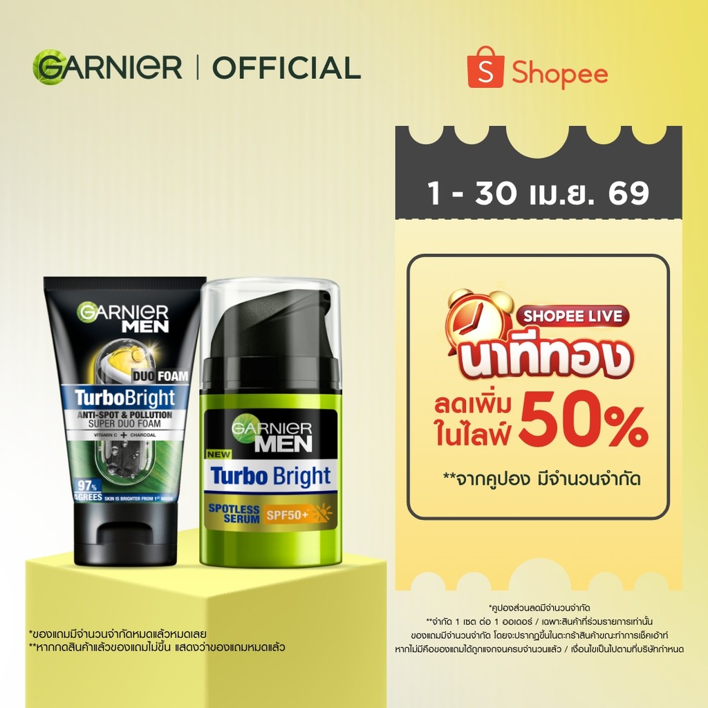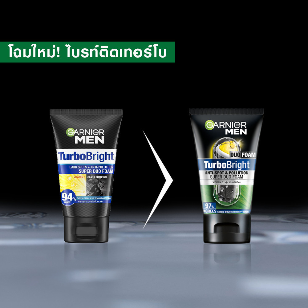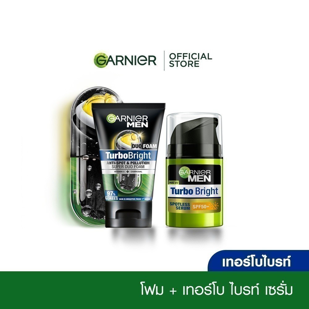 GARNIER MEN ชุดเซตขาวใสไกลจุด เทอร์โบ ไบรท์ เซรั่ม 40 มล + โฟม 100 มล Garnier Men Set Foam+Serum (ครีมผู้ชาย,โฟมผู้ชาย)