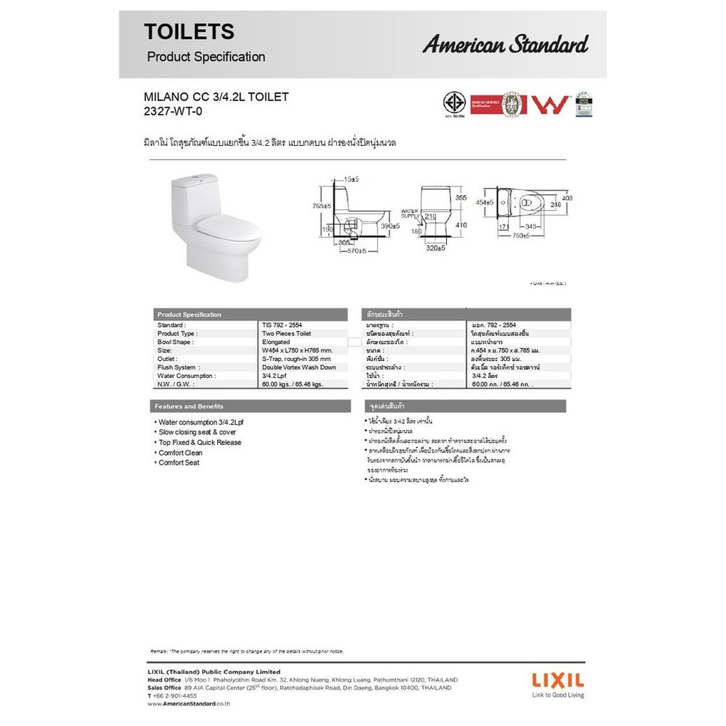 American Standard สุขภัณฑ์สองชิ้น มิลาโน 3/4.2L พร้อมฝารองนั่งปิดนุ่มนวล รุ่น 2327SC-WT-0 ขนาด สีขาว