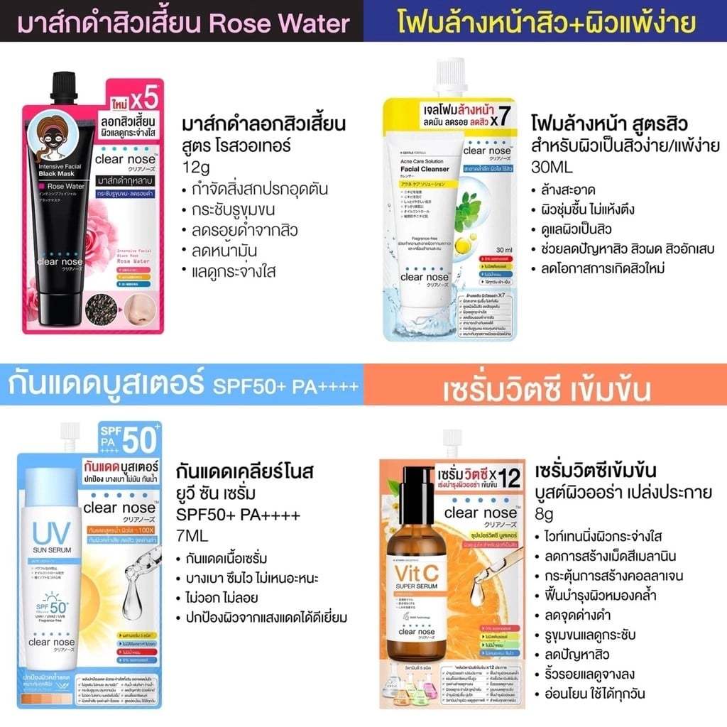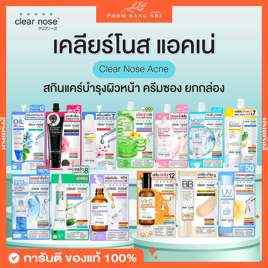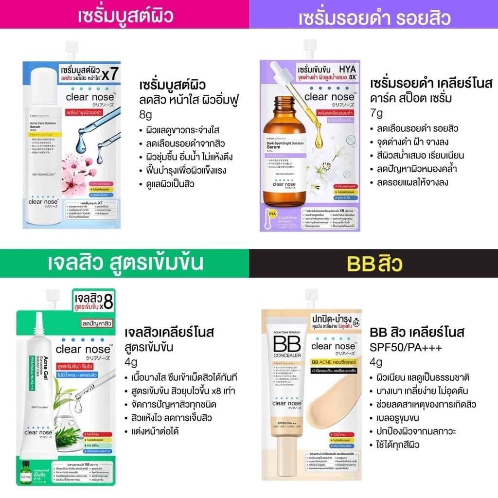(ครีมซอง+ยกกล่อง) Clear Nose เคลียร์โนส เซรั่ม กันแดด มอยซ์เจอไรเซอร์ บีบี แอคเน่ คอนซีลเลอร์ ยกกล่อง 1 กล่อง มี 6 ซอง