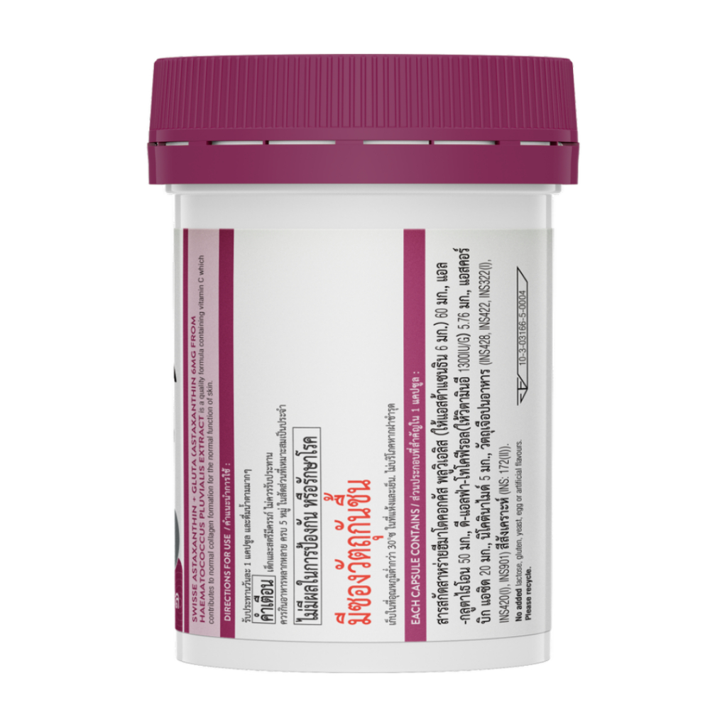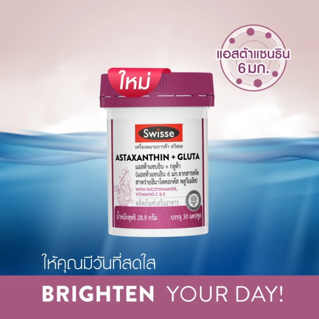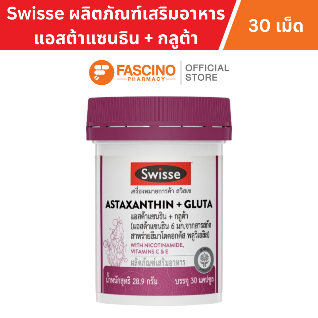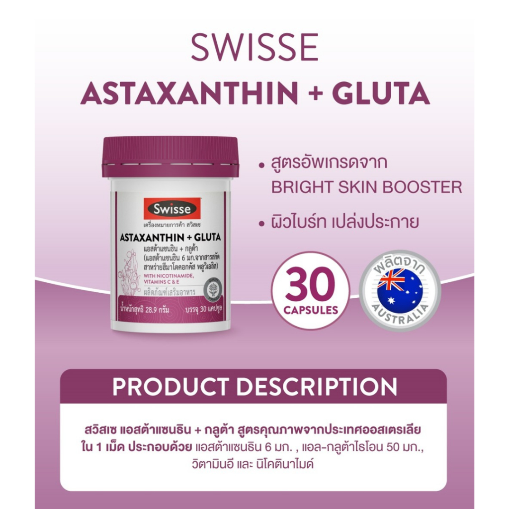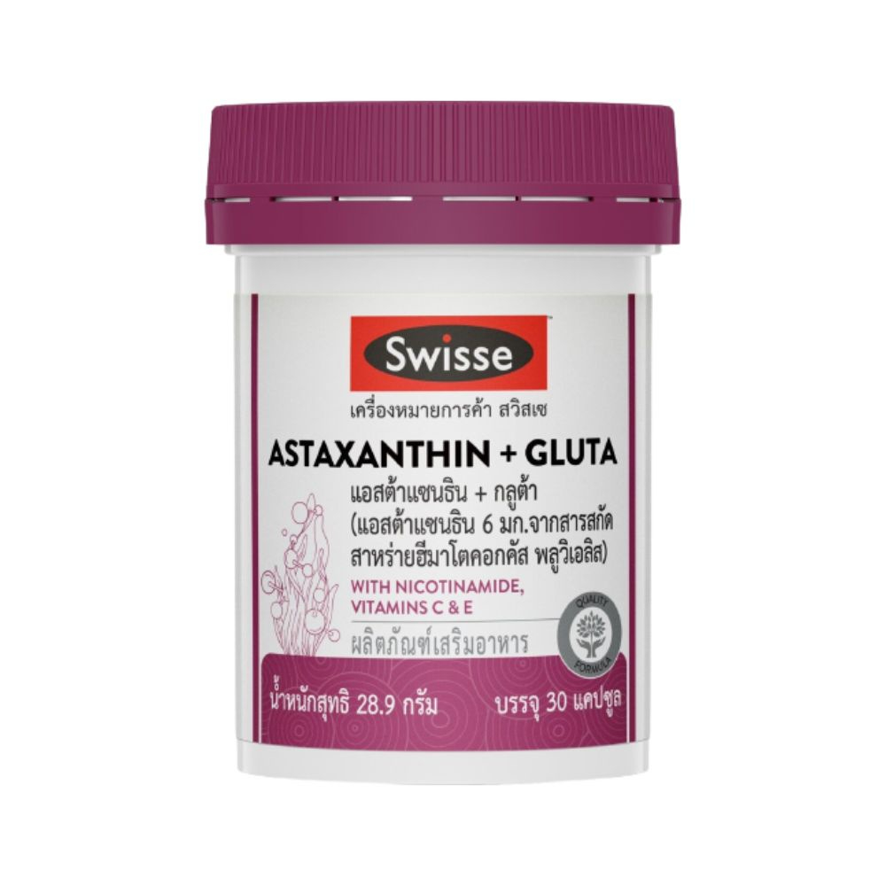 Swisse Astaxanthin + Gluta ผลิตภัณฑ์เสริมอาหารสวิสเซ แอสต้าแซนธิน + กลูต้า สูตรคุณภาพสูง (30 เม็ด)