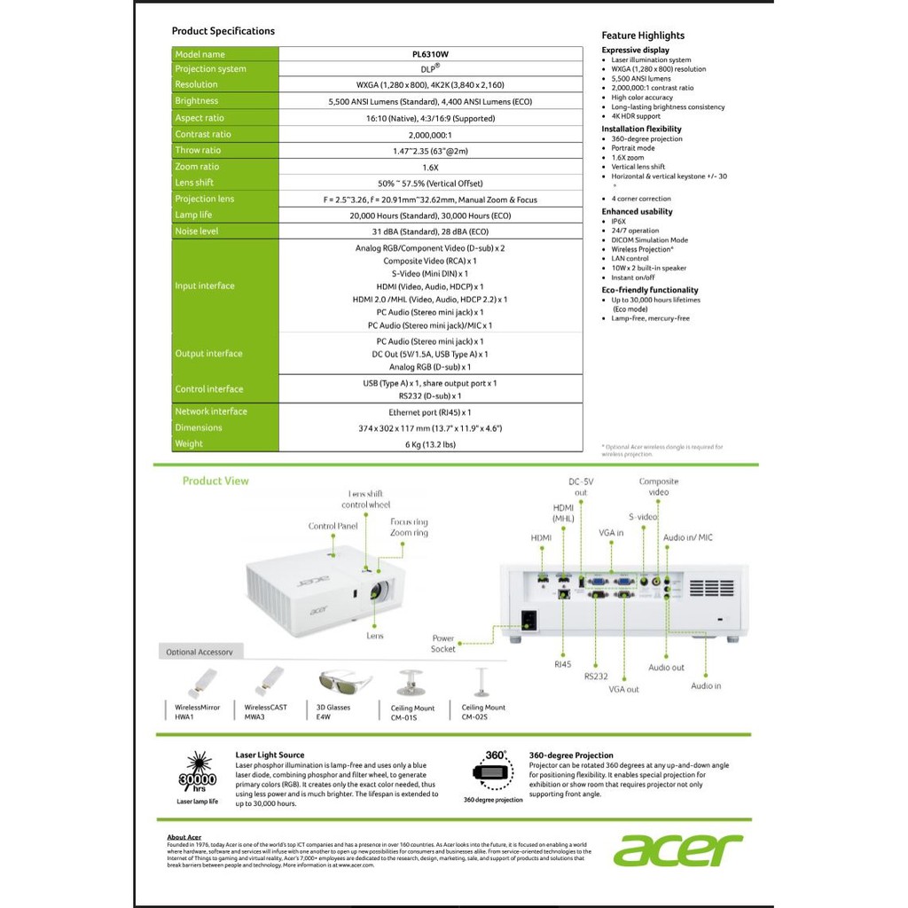 ACER Projector รุ่น PL6310W (Laser / 5,500 lm / WXGA) ประกันศูนย์ Acer Thailand 3 ปี
