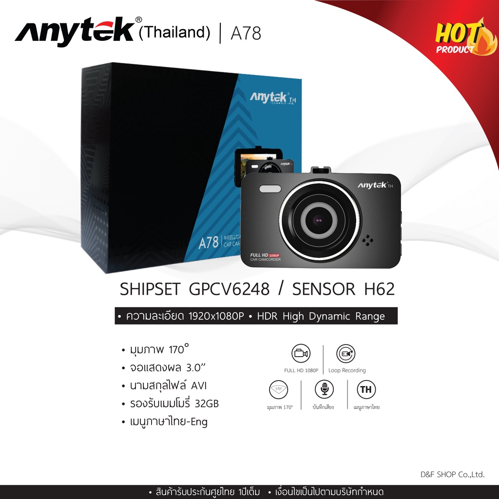 Anytek Thailand รุ่น A78/XCAM X78 กล้องติดรถยนต์กล้องหน้าเท่านั้น! CAR DVR FHD1080P 70mai XCAM