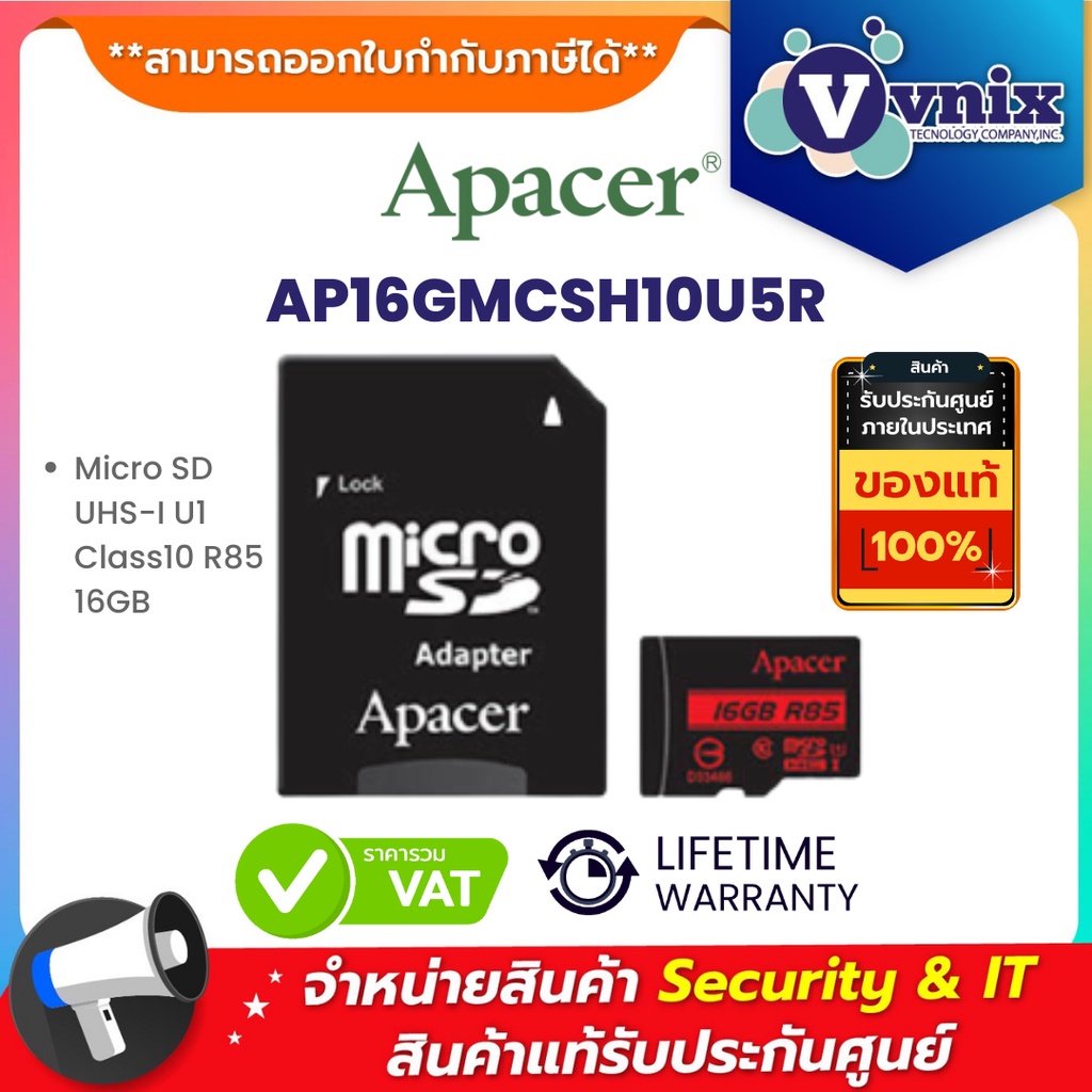 Apacer เอสดีการ์ด AP16GMCSH10U5R microSDXC/SDHC UHS-I U1 Class 10 (R85 MB/s) 16GB รับประกันตลอดการใช้งาน By Vnix Group