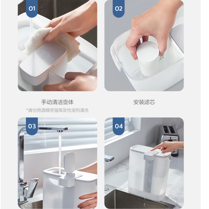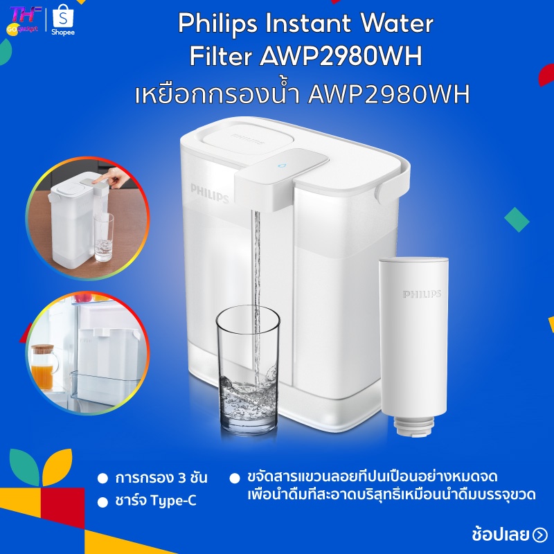 Philips water AWP2980WH เหยือกกรองน้ํา เหยือกกรองน้ำดื่มซีโร่วอเตอร์ แบบ ชาร์จ การกรอง 3 ชั้น