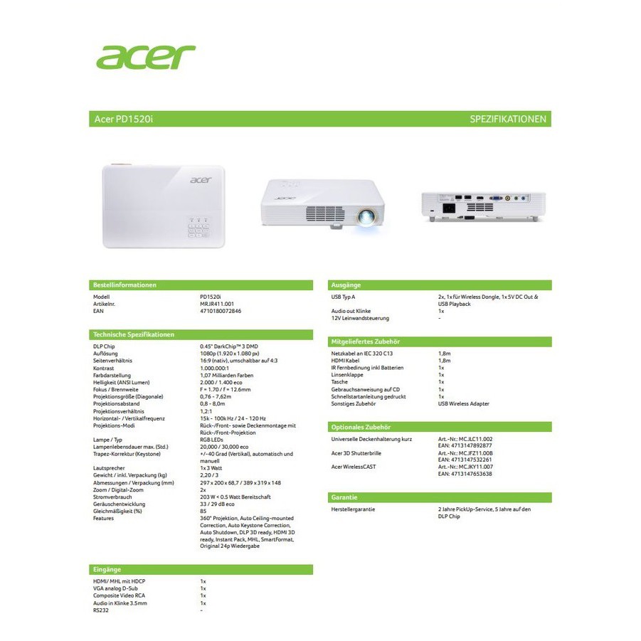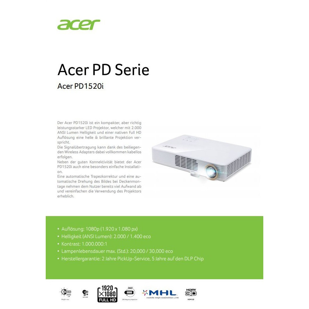 ACER Projector PD1520i (LED / 3,000 lm / Full HD) ประกันศูนย์ Acer Thailand 3 ปี