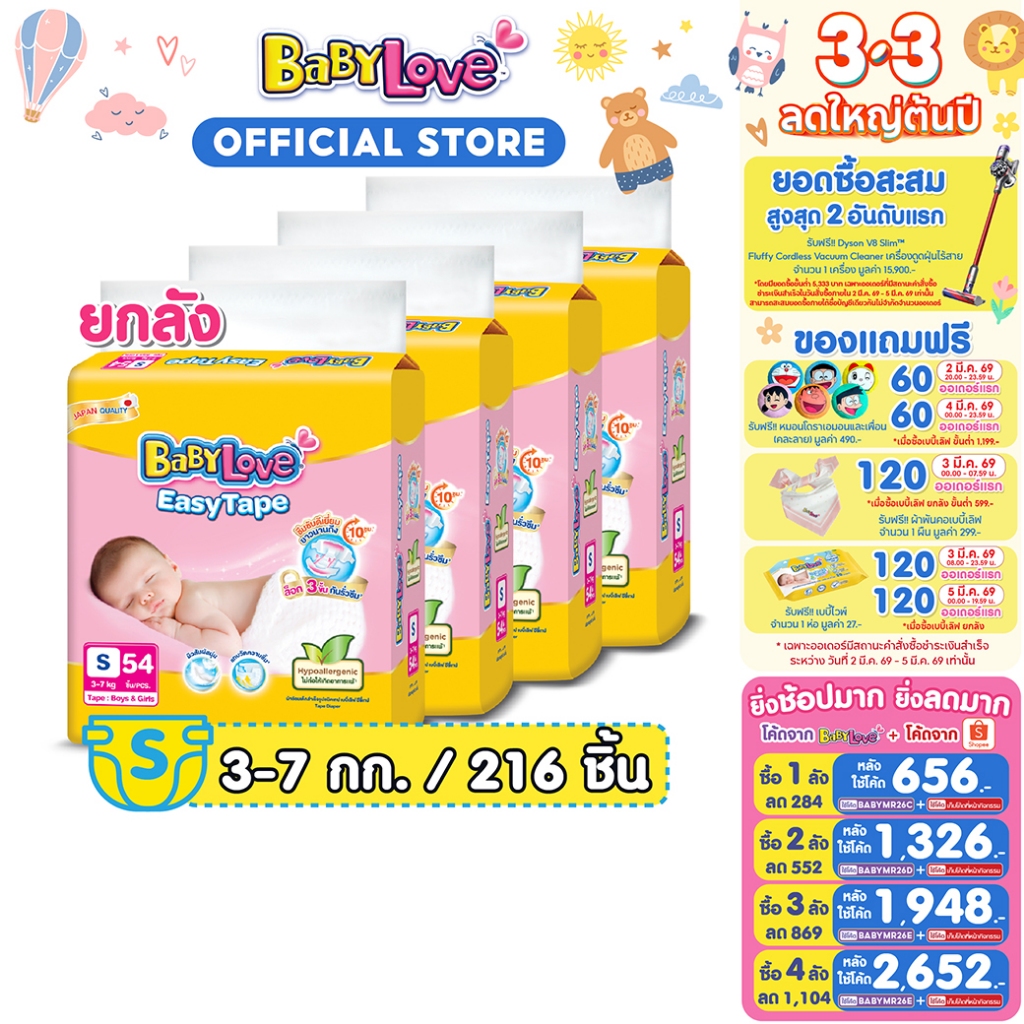 [เหลือ 700 โค้ด BABYMR26C+โค้ด Shopee] BABYLOVE EASY TAPE เบบี้เลิฟ อีซี่ เทป ขนาดจัมโบ้ ไซส์S (54ชิ้น) x4แพ็ค[ขายยกลัง]