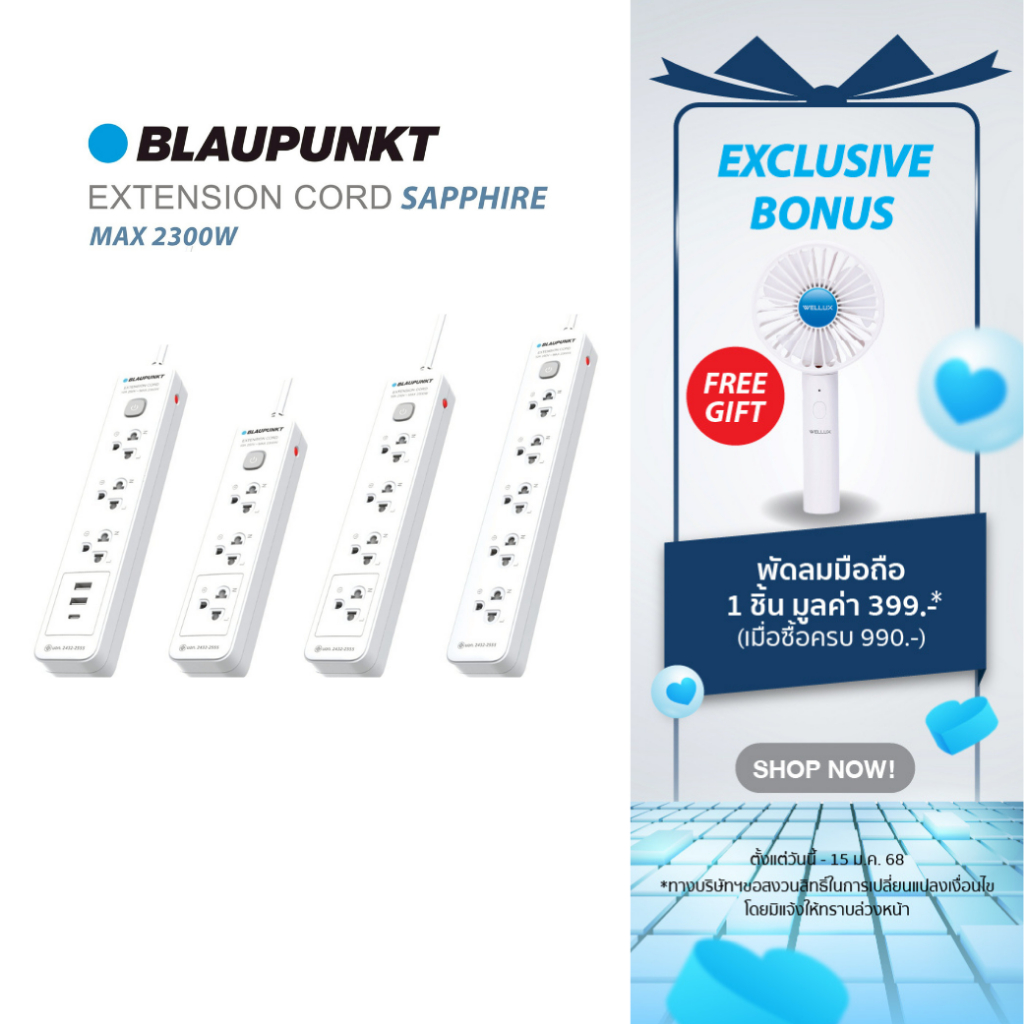 [ซื้อครบ990แถมพัดลมมือถือ]BLAUPUNKT ปลั๊กไฟมินิมอล สวิตช์รวม 3-5 ช่อง มาตรฐาน มอก.ทองเหลืองแท้100%