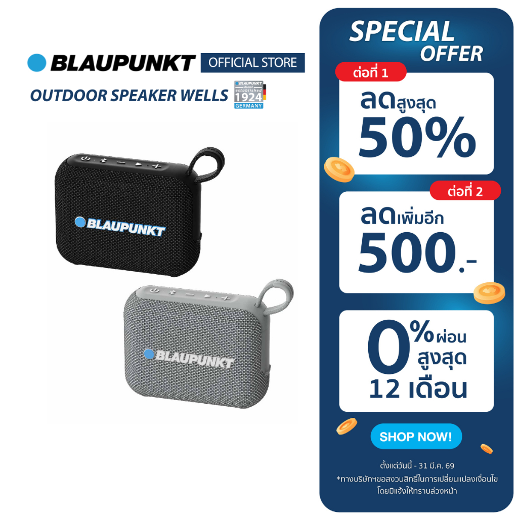 BLAUPUNKT ลำโพงบลูทูธกันน้ำ IPX6 พกพาง่าย Bluetooth 6.0 เบสแน่น 5 วัตต์ แบตเตอรี่ 2000mAh รุ่น WELLS