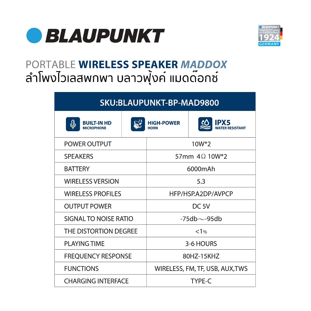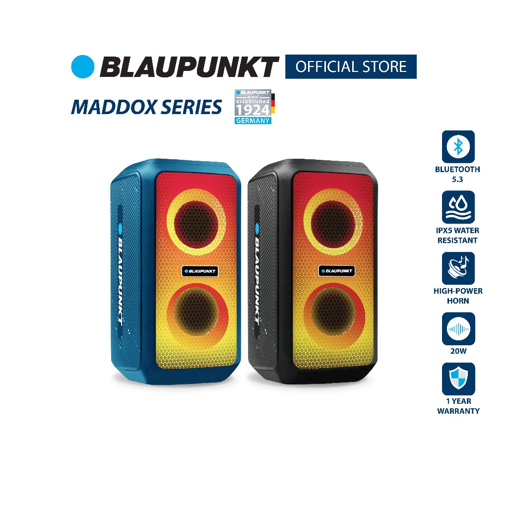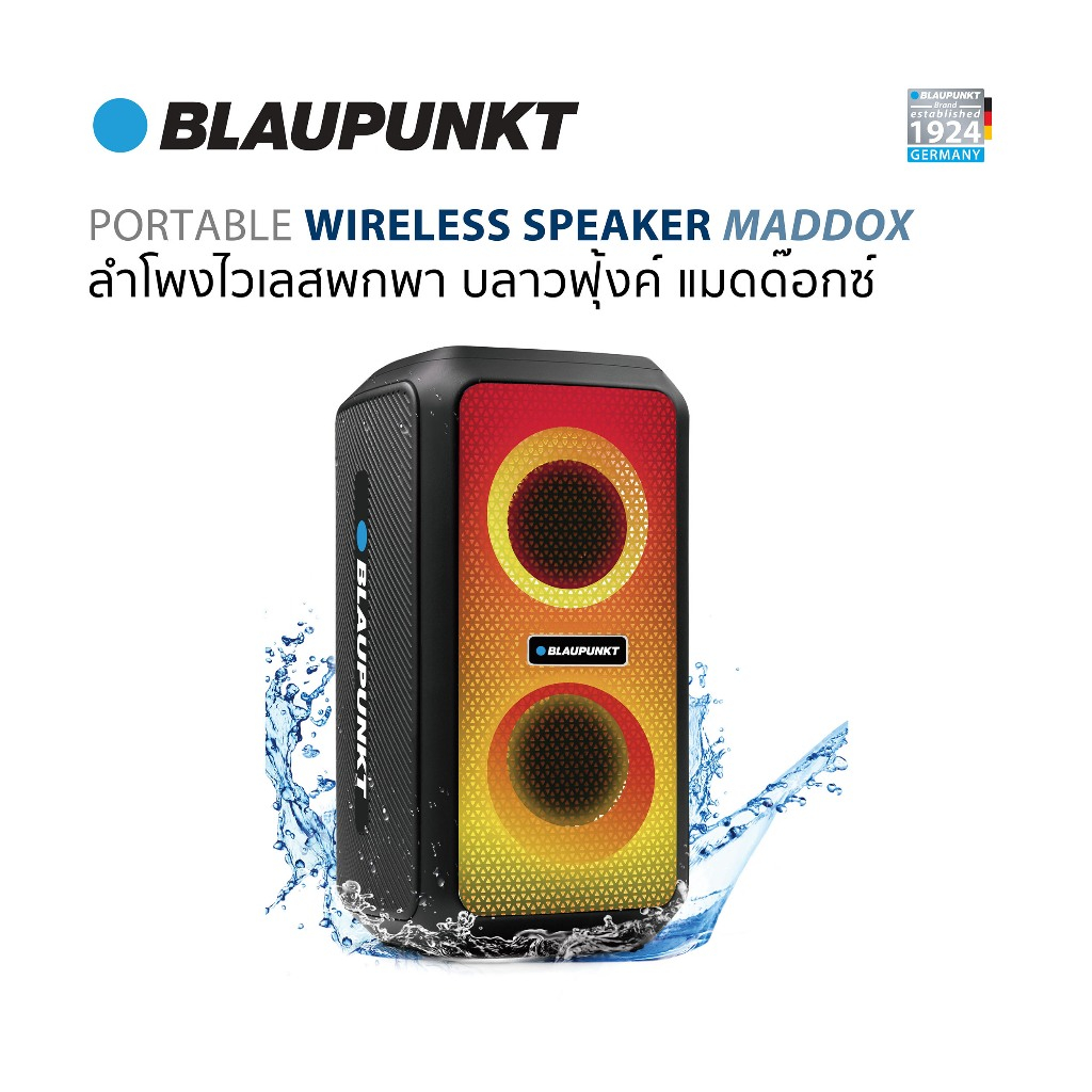 BLAUPUNKT ลำโพงบลูทูธไร้ส ายกันน้ำ IPX5 แบบพกพา กำลังขับ 20วัตต์ รุ่น MADDOX SERIES แบตเตอรี่ 6000mAh