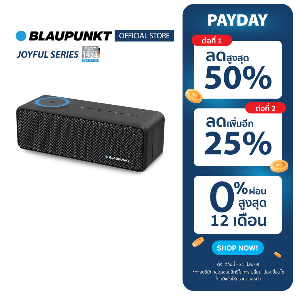 BLAUPUNKT ลำโพงบลูทูธพกพา 20 วัตต์ มาพร้อม WIRELESS CHARGING รุ่น JOYFUL แบตเตอรี่ 2000mAh