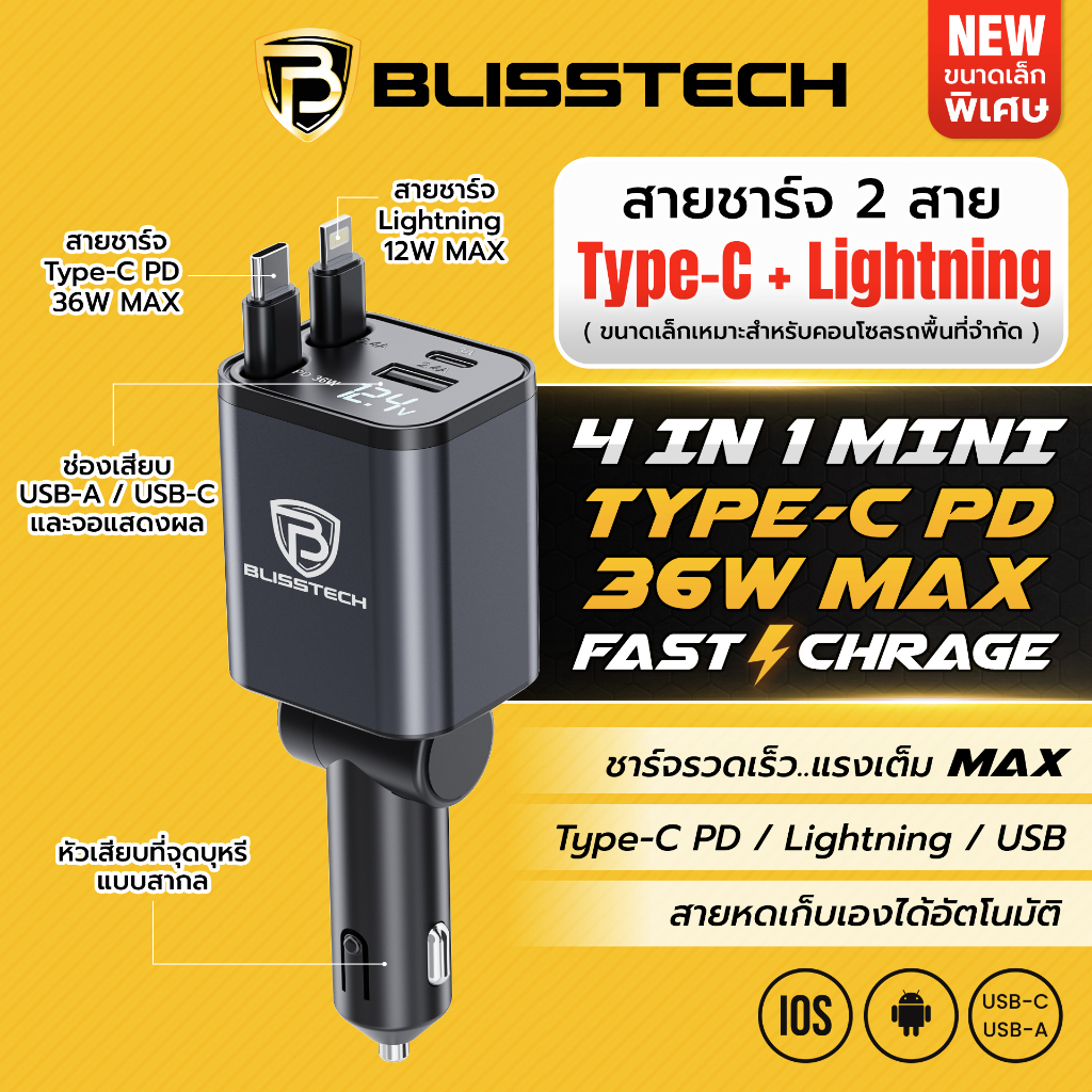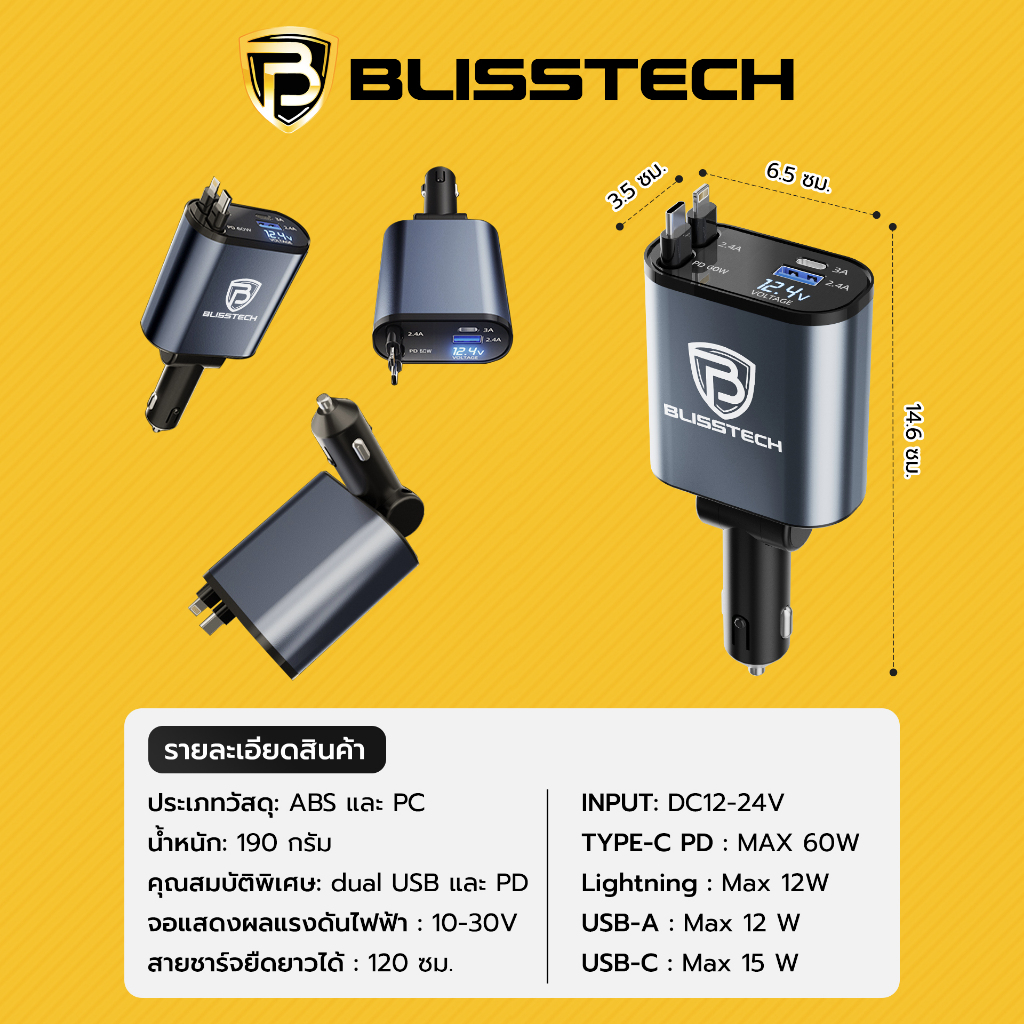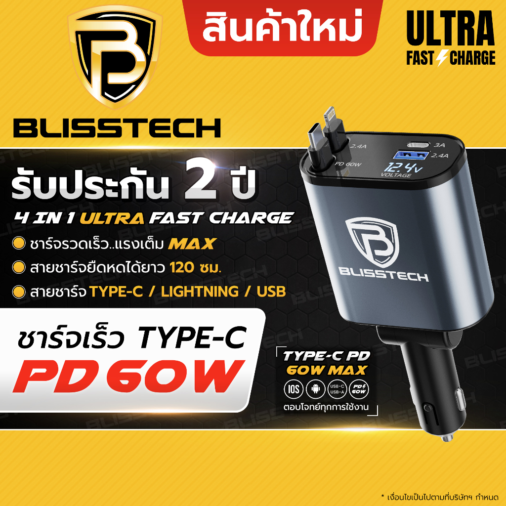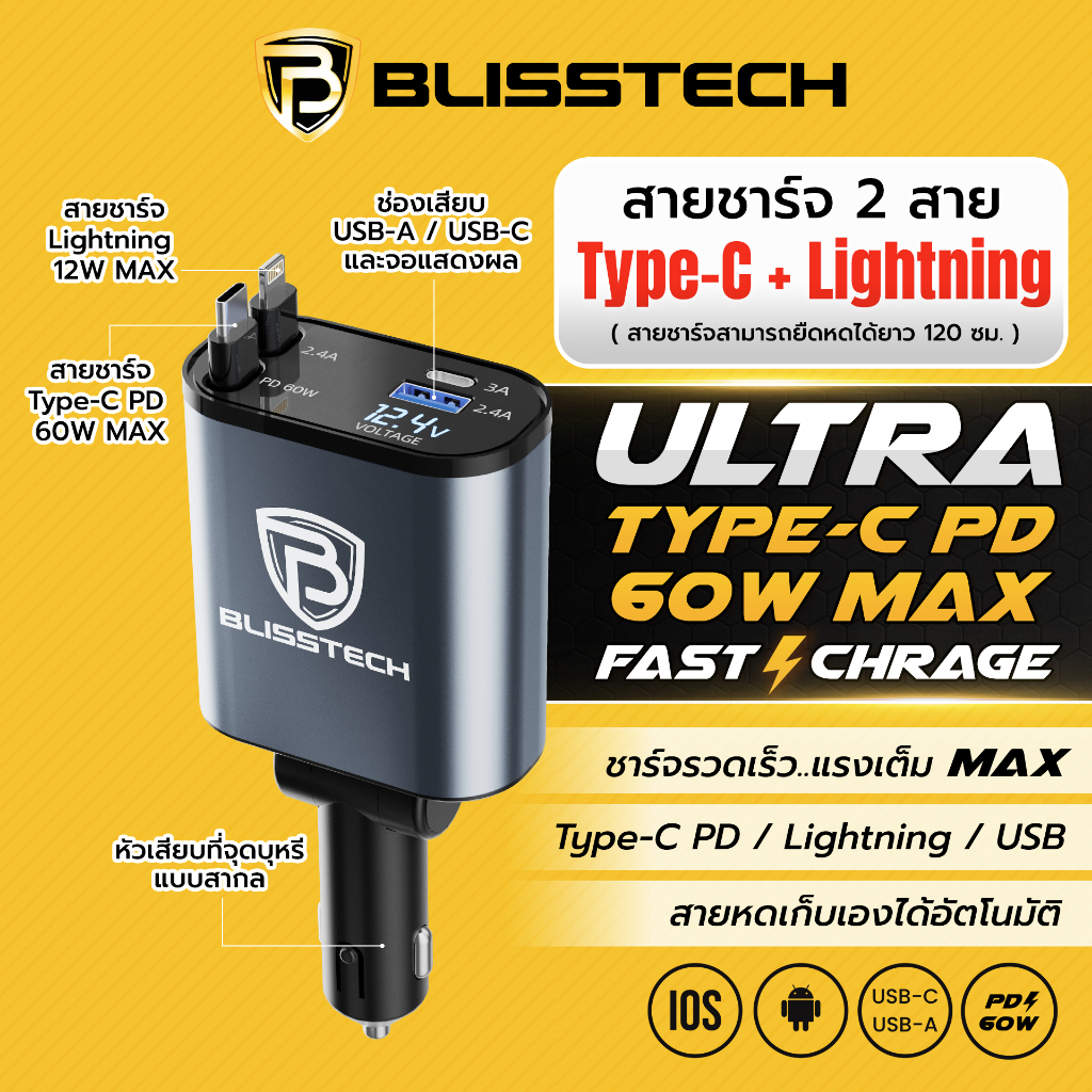 BLISSTECH ULTRA 60W FAST CHARGE ที่ชาร์จในรถ หัวชาร์จในรถ สายชาร์จในรถยนต์ สายยืดหดได้ 120ซม. Type-C USB Lightning