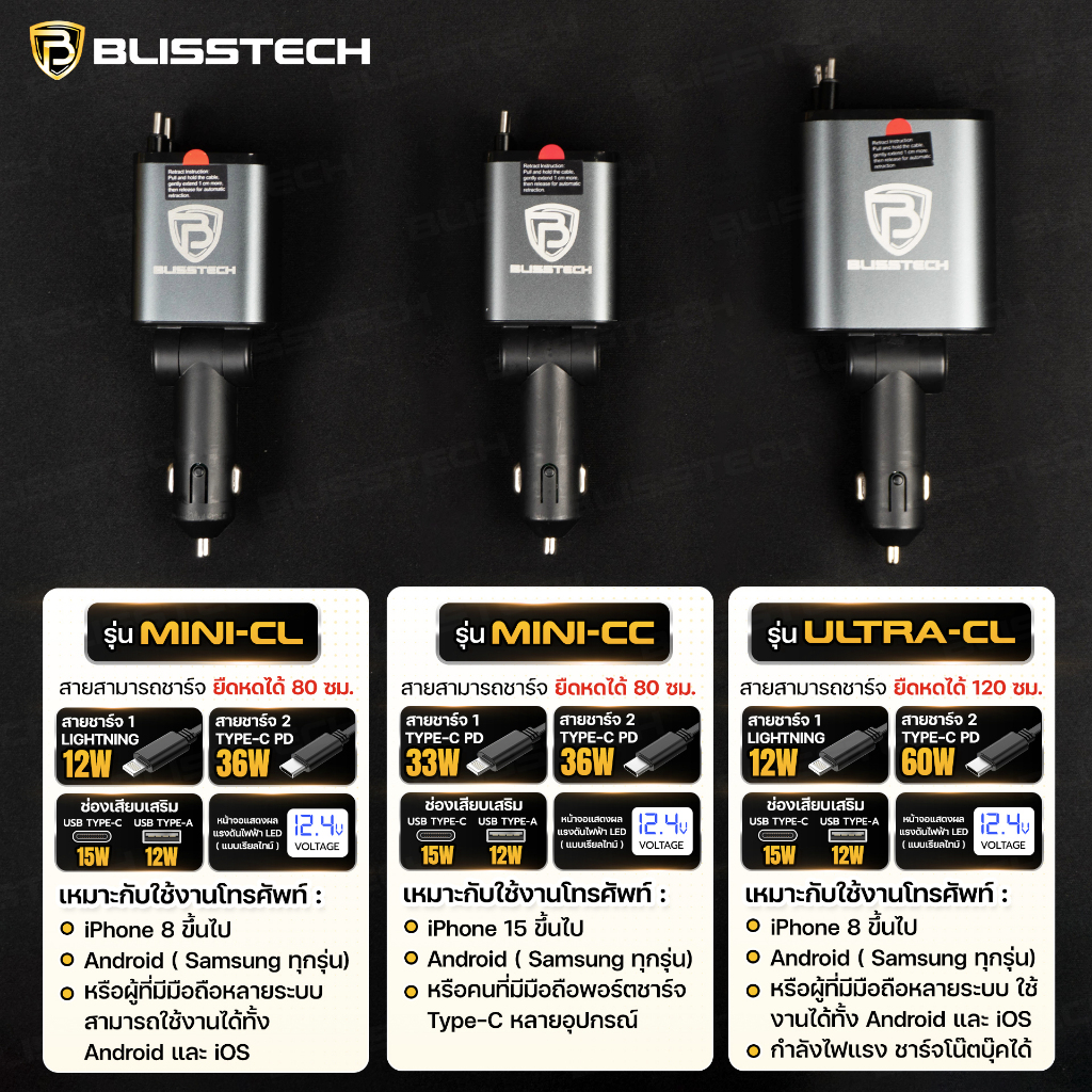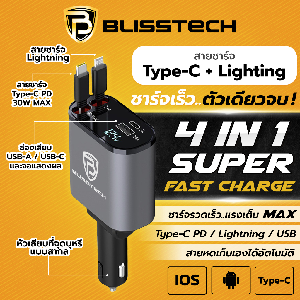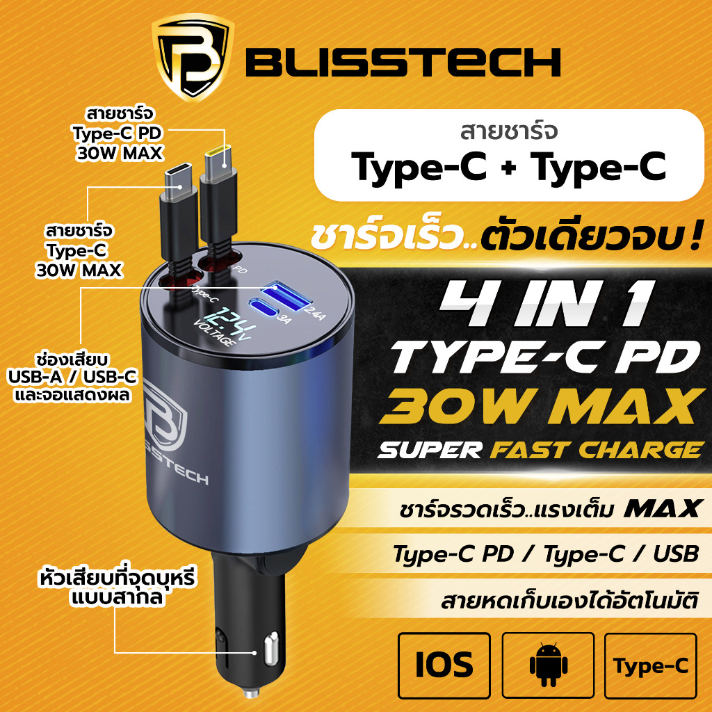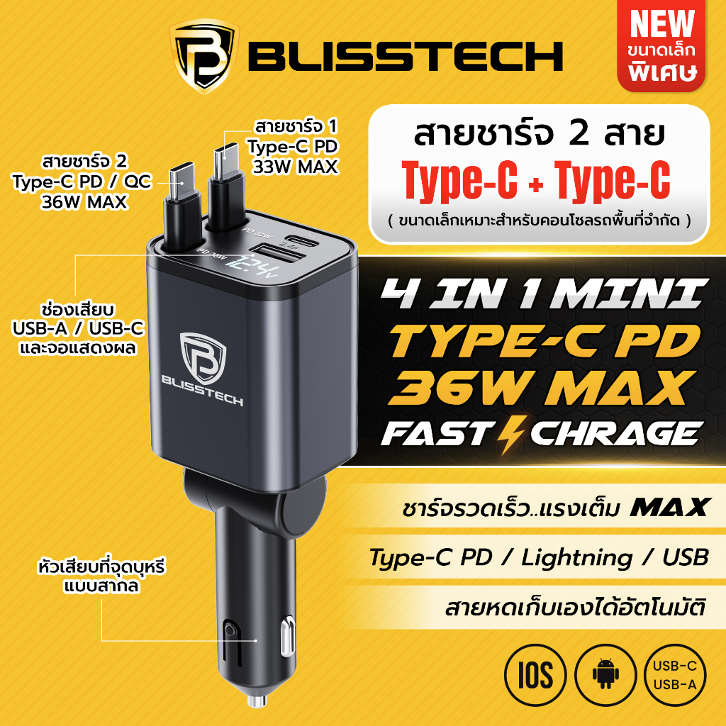 BLISSTECH ULTRA 60W FAST CHARGE ที่ชาร์จในรถ หัวชาร์จในรถ สายชาร์จในรถยนต์ สายยืดหดได้ 120ซม. Type-C USB Lightning