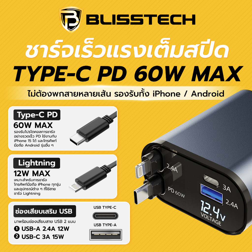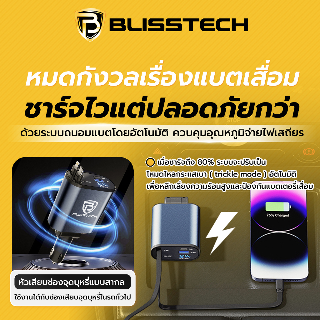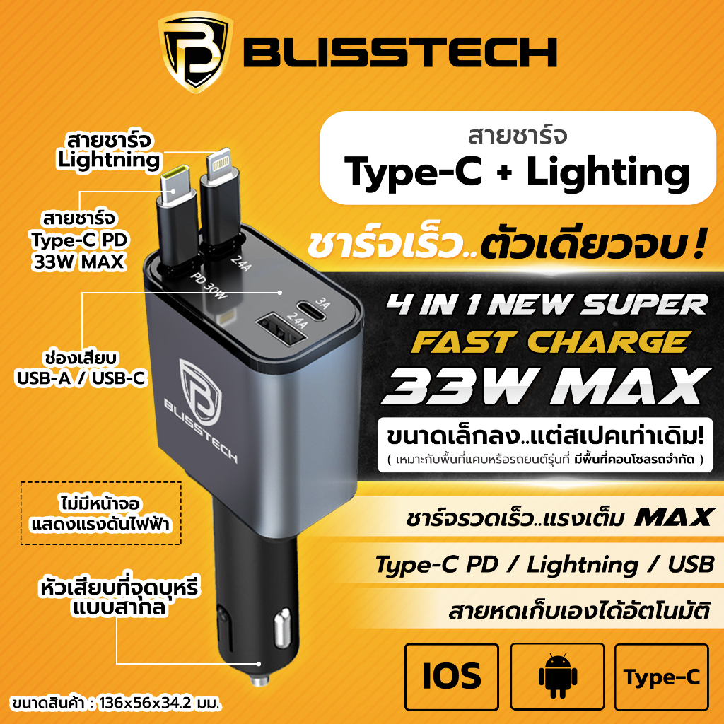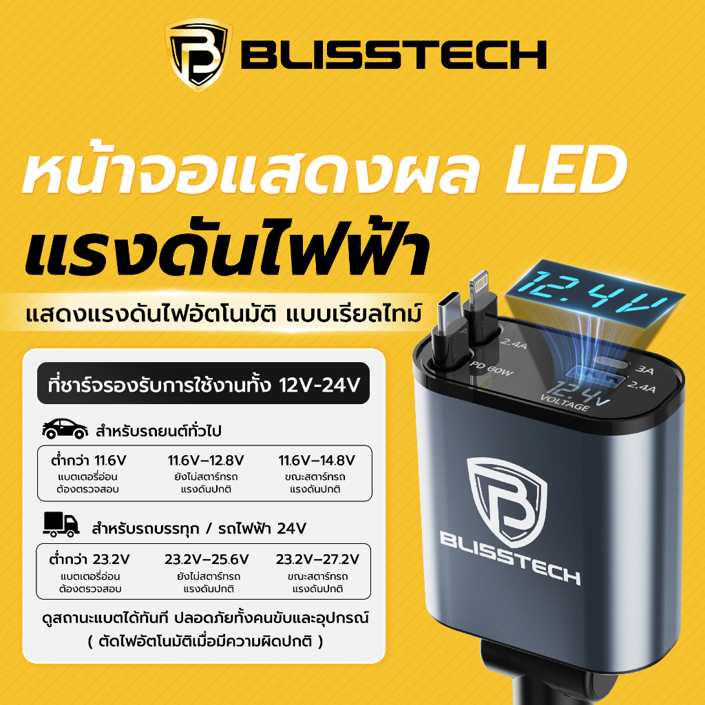 BLISSTECH ULTRA 60W FAST CHARGE ที่ชาร์จในรถ หัวชาร์จในรถ สายชาร์จในรถยนต์ สายยืดหดได้ 120ซม. Type-C USB Lightning