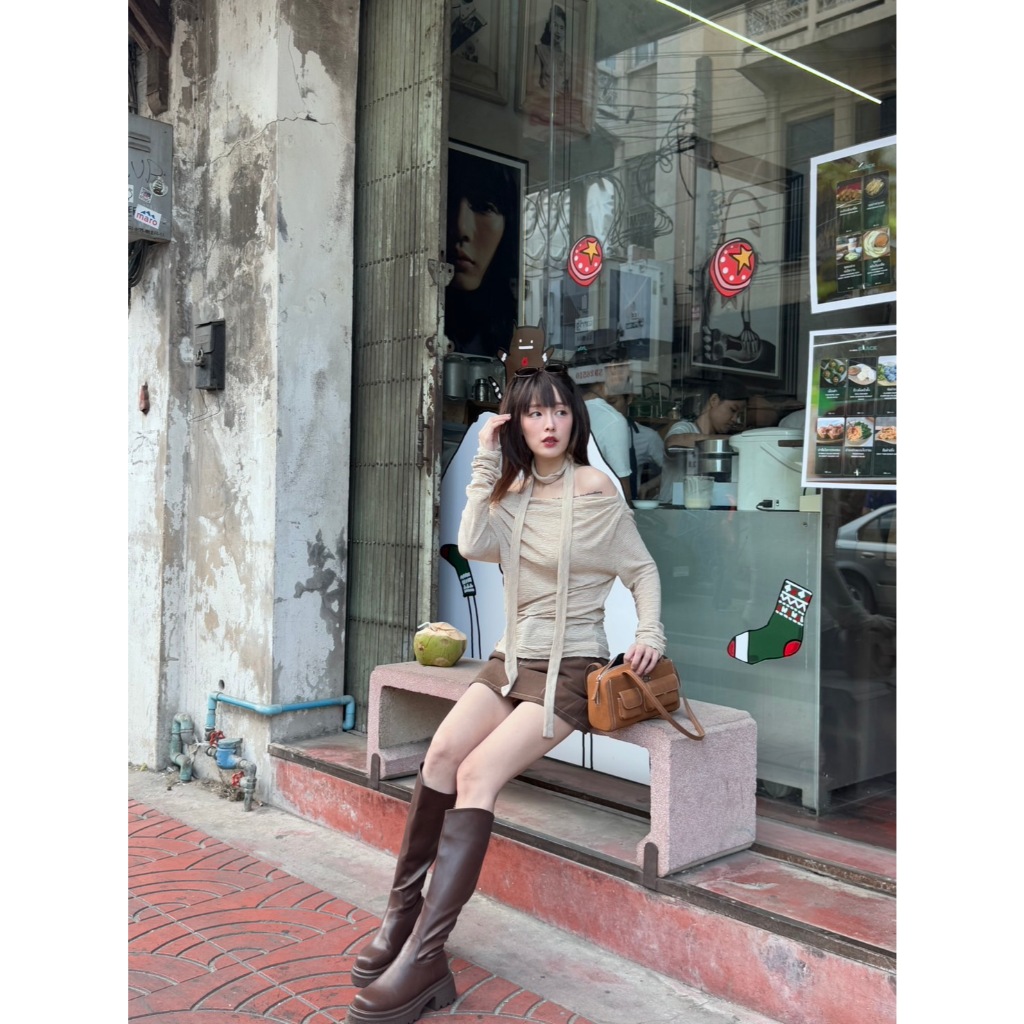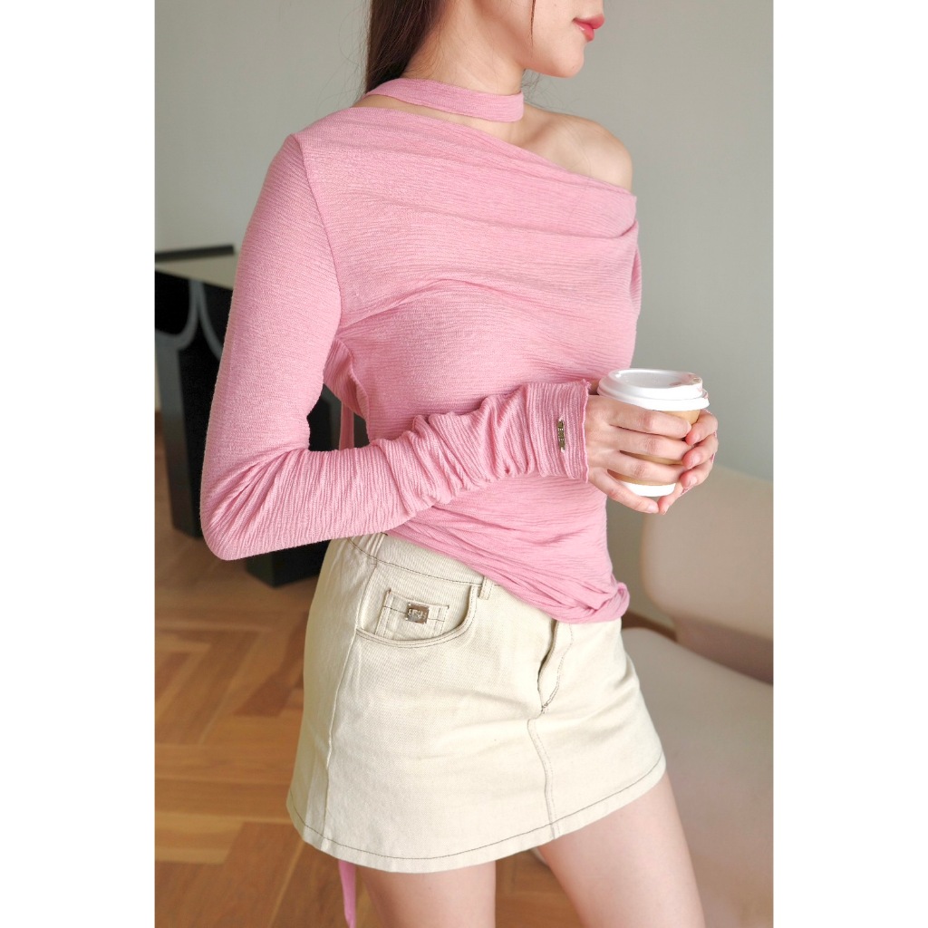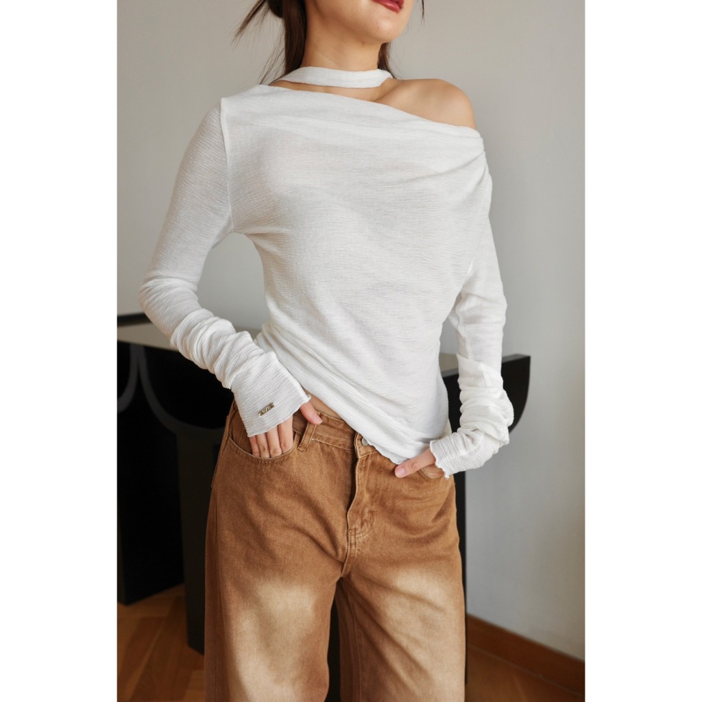 BXB - IVY TOP เสื้อปาดไหล่แขนยาวผ้ายืด แถมผ้าพันคอ