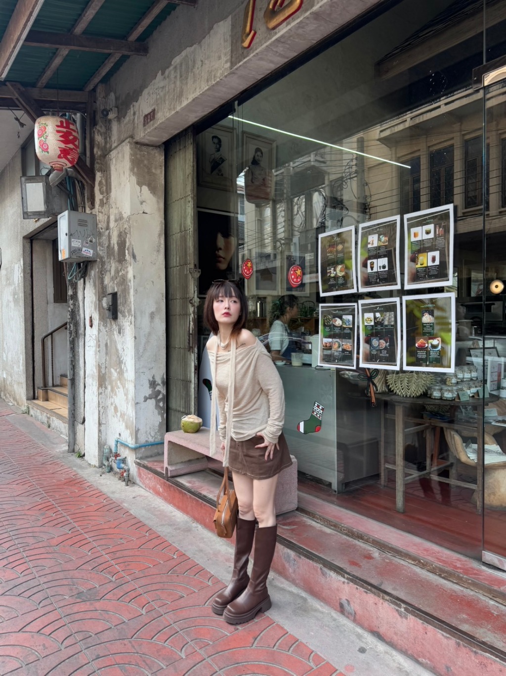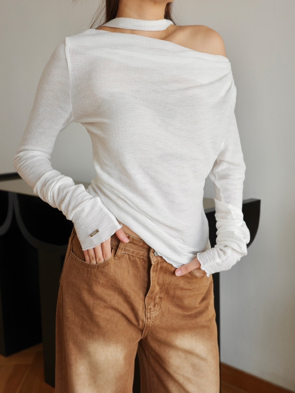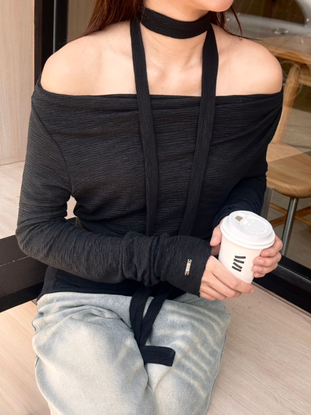 BXB - IVY TOP เสื้อปาดไหล่แขนยาวผ้ายืด แถมผ้าพันคอ