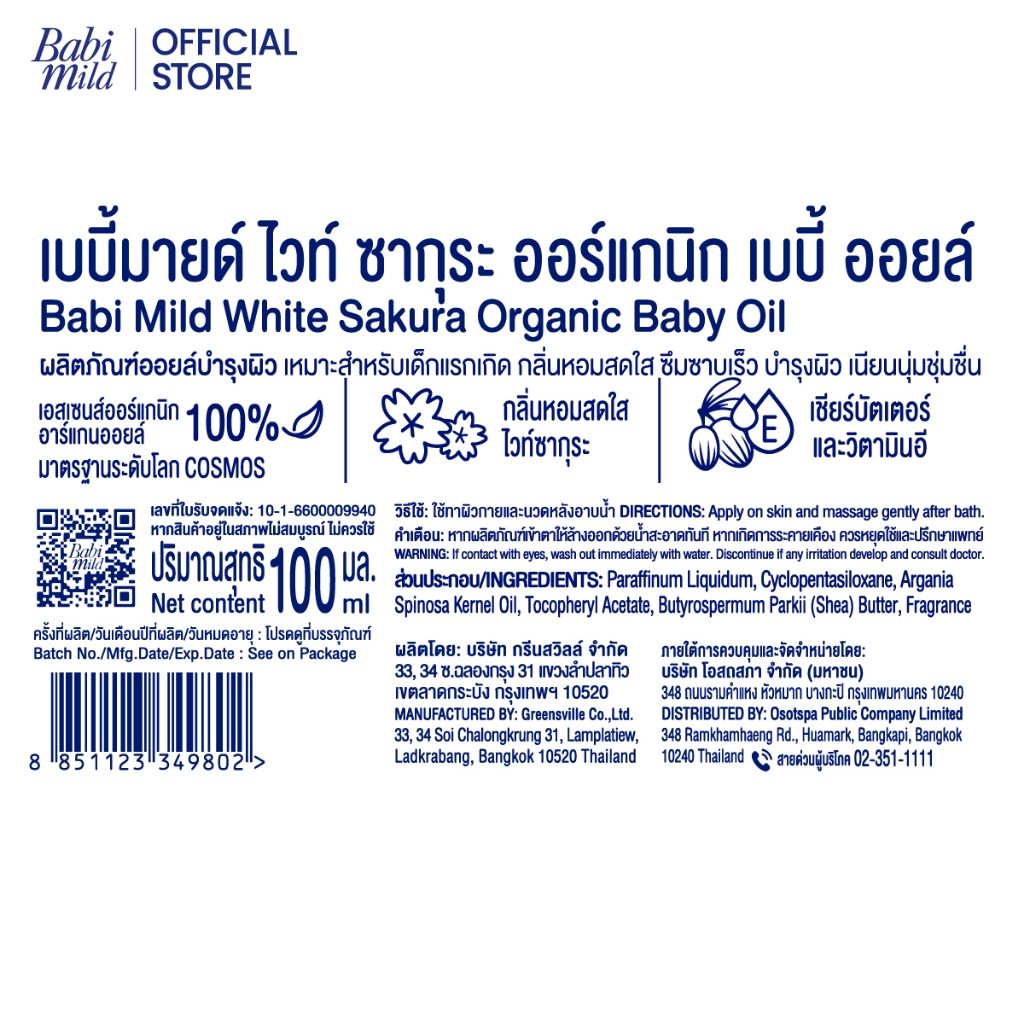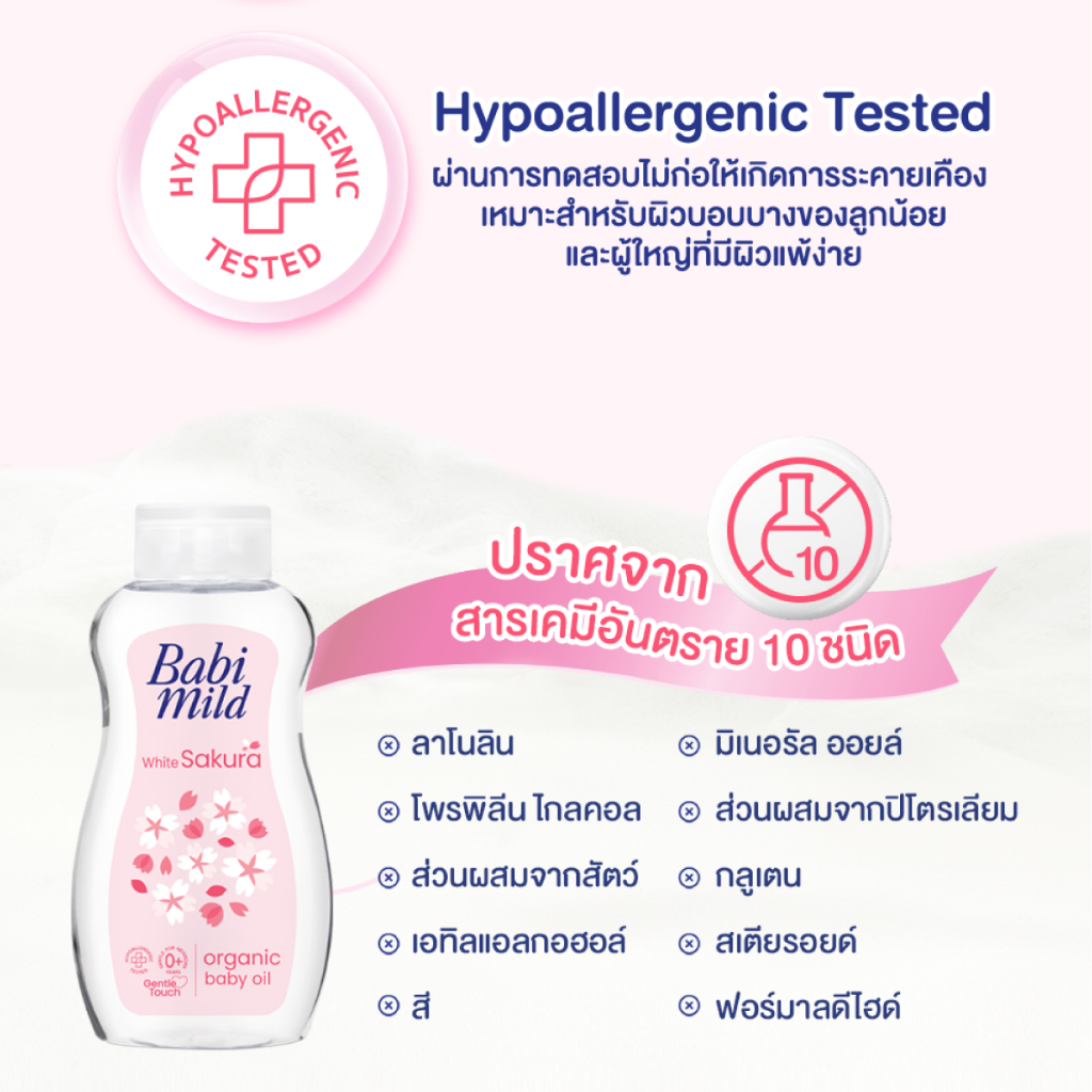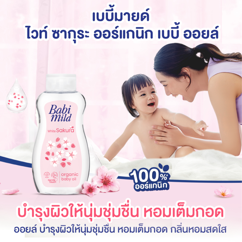 [มี3แพ็คให้เลือก] เบบี้มายด์ เบบี้ออยล์ ไวท์ ซากุระ พลัส 100 มล. / Babi Mild White Sakura Baby Oil 100ml