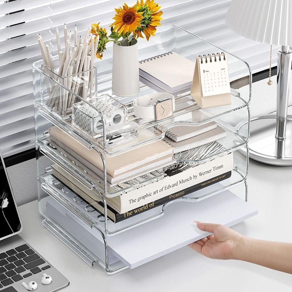 Backstage A4 Document Paper Organizer, Stackable Large Capacity Desktop File Tray, Multifunction Transparent Stationery Book Storage Rack Home Office