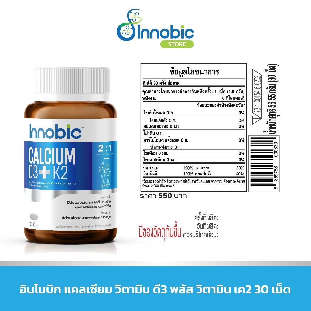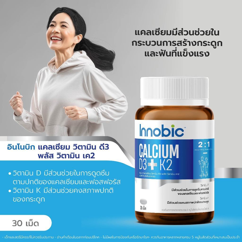 Innobic Calcium Vitamin D3 Plus Vitamin K2 อินโนบิก แคลเซียม วิตามิน ดี3 พลัส วิตามิน เค2 [ 30 เม็ด ] เสริม แคลเซียม บำ