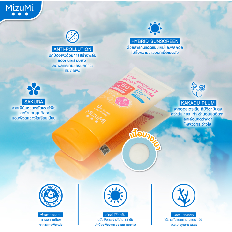 (หลอด180ml.) Mizumi มิซึมิ ยูวี ไบรท์ บอดี้ เซรั่ม สูตรไม่มีน้ำหอม SPF50+ PA++++ กันแดดทาตัว [0379]
