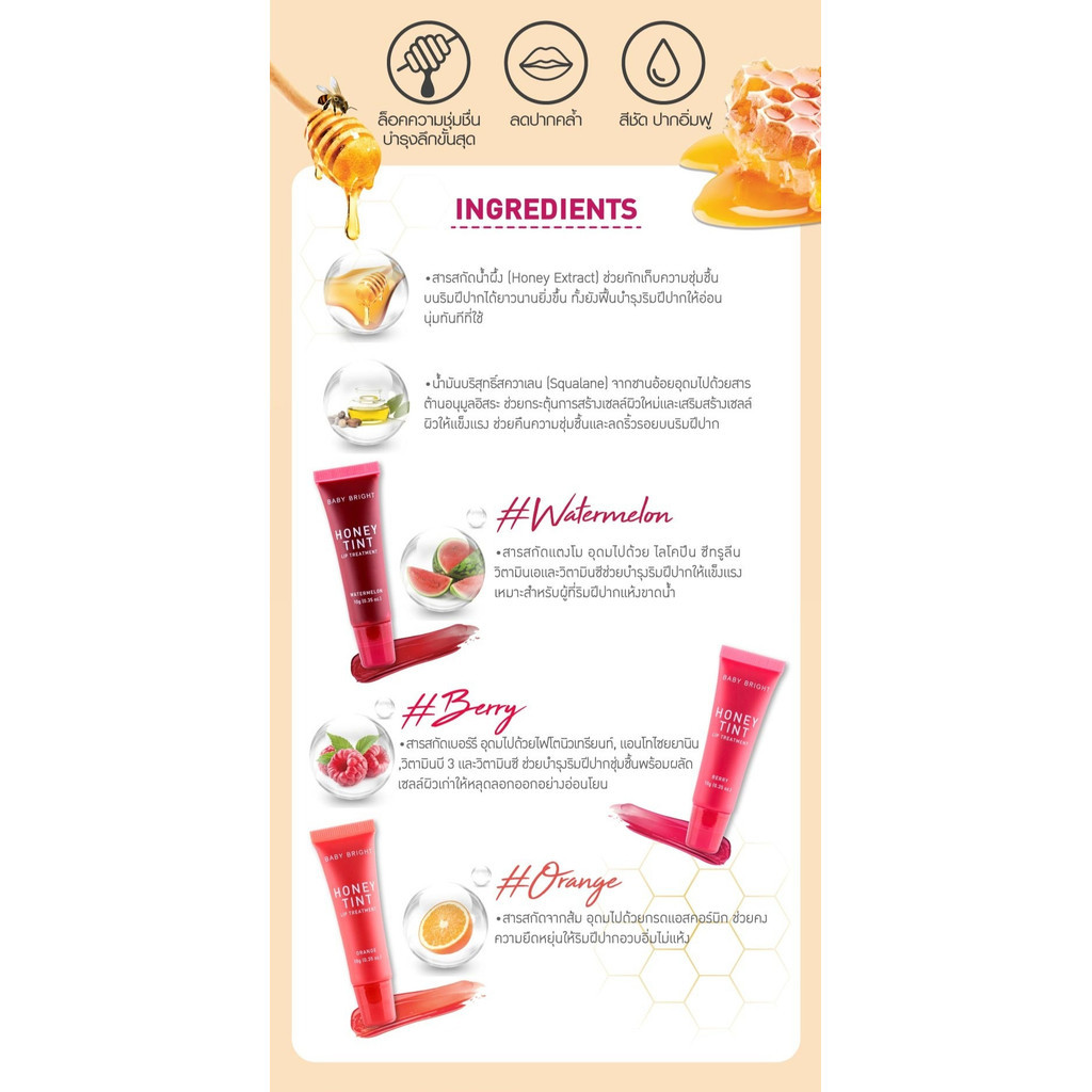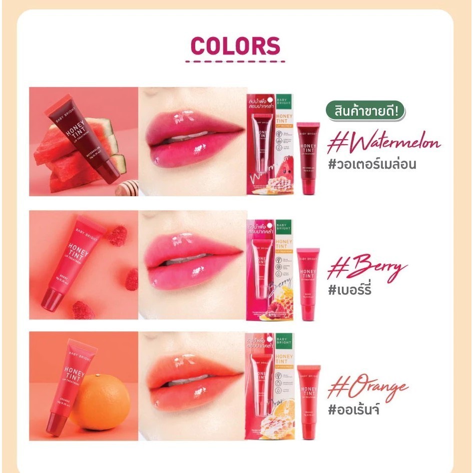 Baby Bright Honey Tint Lip Treatment 10g เบบี้ ไบร์ท ฮันนี่ ทินท์ ลิป ทรีทเม้นท์ มีให้เลือก 3 สี ปริมาณ 10 กรัม