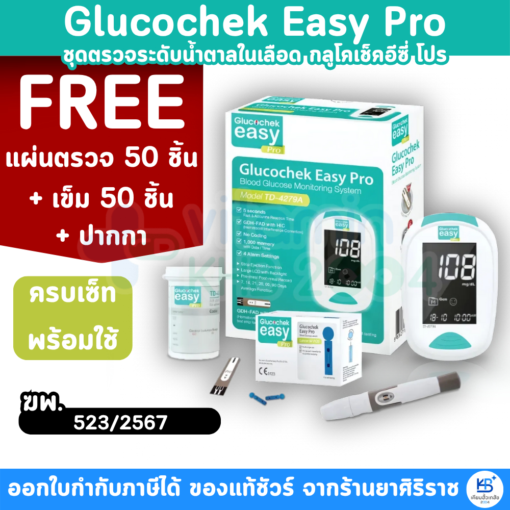 [รับประกันตลอดอายุการใช้งาน] Glucochek Easy Pro ชุดเครื่องตรวจน้ำตาล (แถบตรวจ50ชิ้น + เข็ม50ชิ้น)