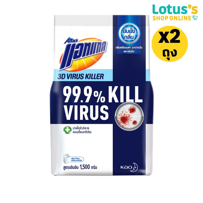 [ทั้งหมด 2 ถุง] แอทแทค 3D ไวรัส คิลเลอร์ ผงซักฟอก สูตรเข้มข้น ขนาด 1500 กรัม ATTACK 3D VIRUS KILLER 1500 G.