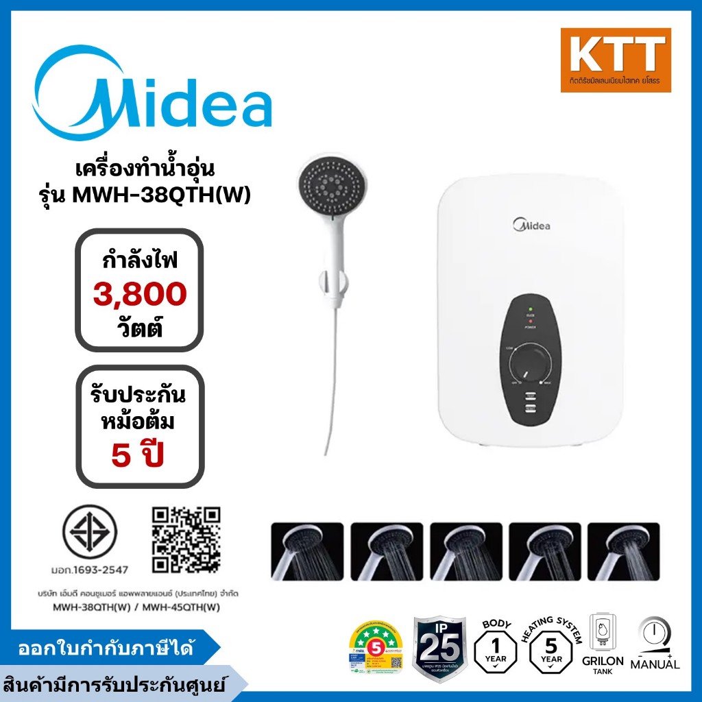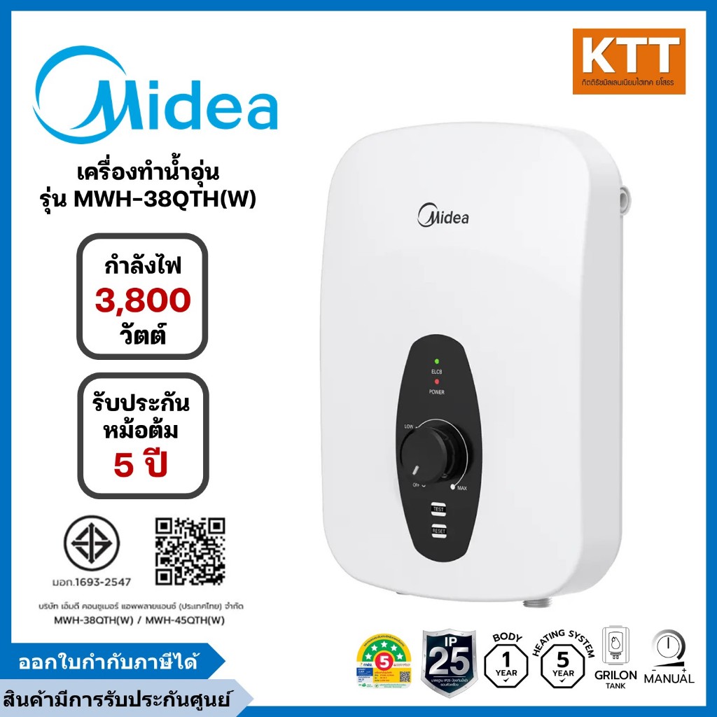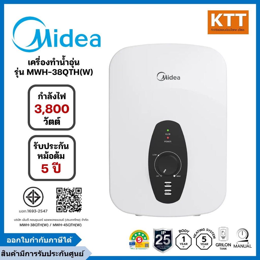 Midea ไมเดีย เครื่องทำน้ำอุ่น 3,800 วัตต์ รุ่น MWH-38QTH(W) สีขาว