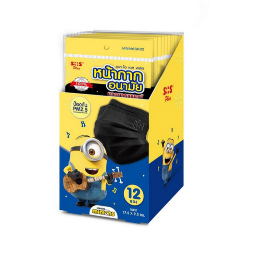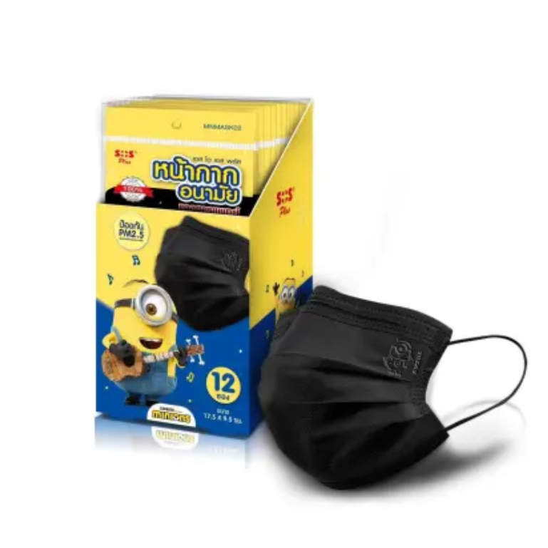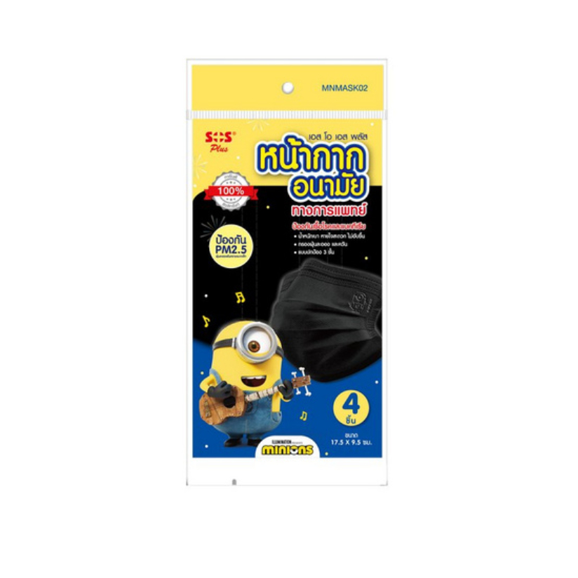 SOS Plus หน้ากากอนามัย ลายมินเนี่ยน สีดำ 12ซอง/กล่อง (ซองละ4ชิ้น)