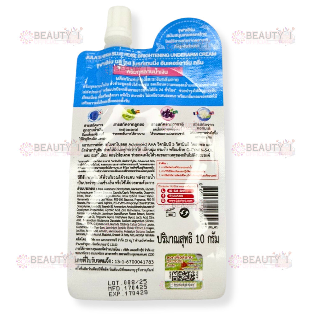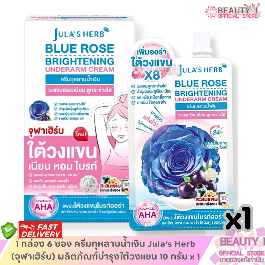 1 กล่อง 6 ซอง Jula Herb Blue Rose Underarm จุฬาเฮิร์บ บลูโรส ไบรท์เทนนิ่ง ครีม บำรุงใต้วงแขนปริมาณ 10 กรัม x 6 ซอง