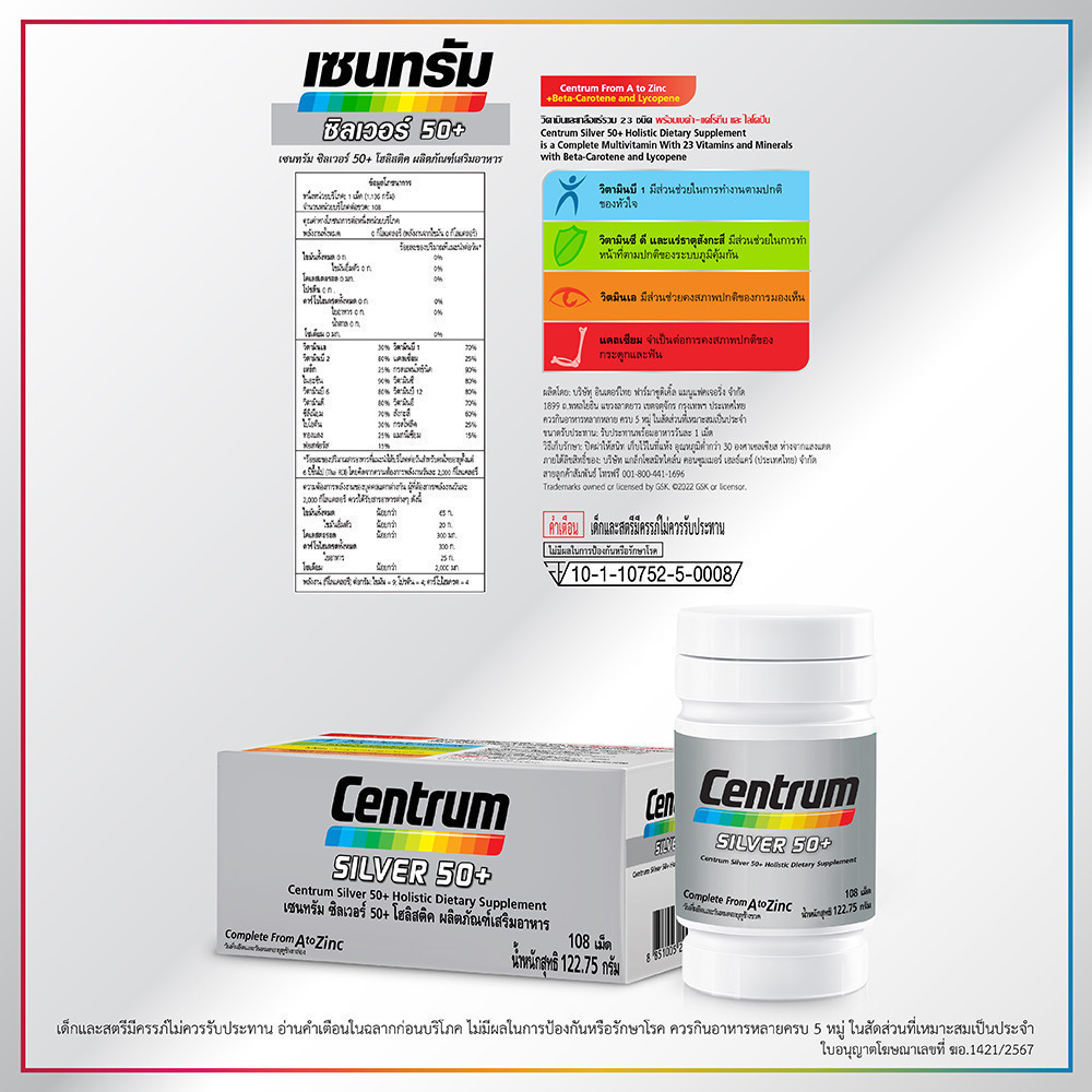 [ส่งฟรี] CENTRUM SILVER 50+ HOLISTIC 108เม็ด x2 เซนทรัมซิวเวอร์ 50+โฮลิสติค ผลิตภัณฑ์เสริมอาหาร วิตามินรวม สำหรับอายุ50+
