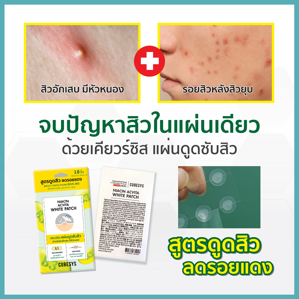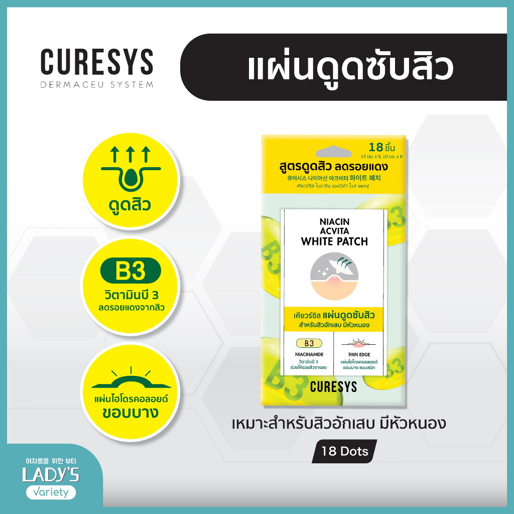 Curesys Niacin Acvita White Patch 18 dots แผ่นแปะสิว ดูดซับสิวพร้อมลดรอย ดูดเกลี้ยง แผ่นบาง เนียน ติดแน่น