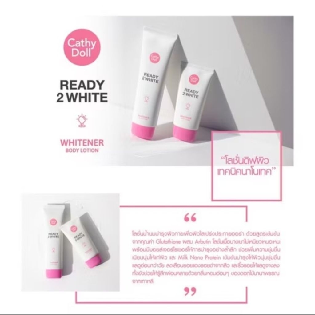 Cathy Doll Ready 2 White Whitener Body Lotion ข้อมูลเกี่ยวกับผลิตภัณฑ์: เป็นโลชั่นบำรุงผิวกายเนื้อน้ำนม 150ml.