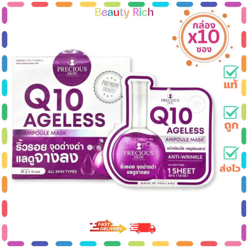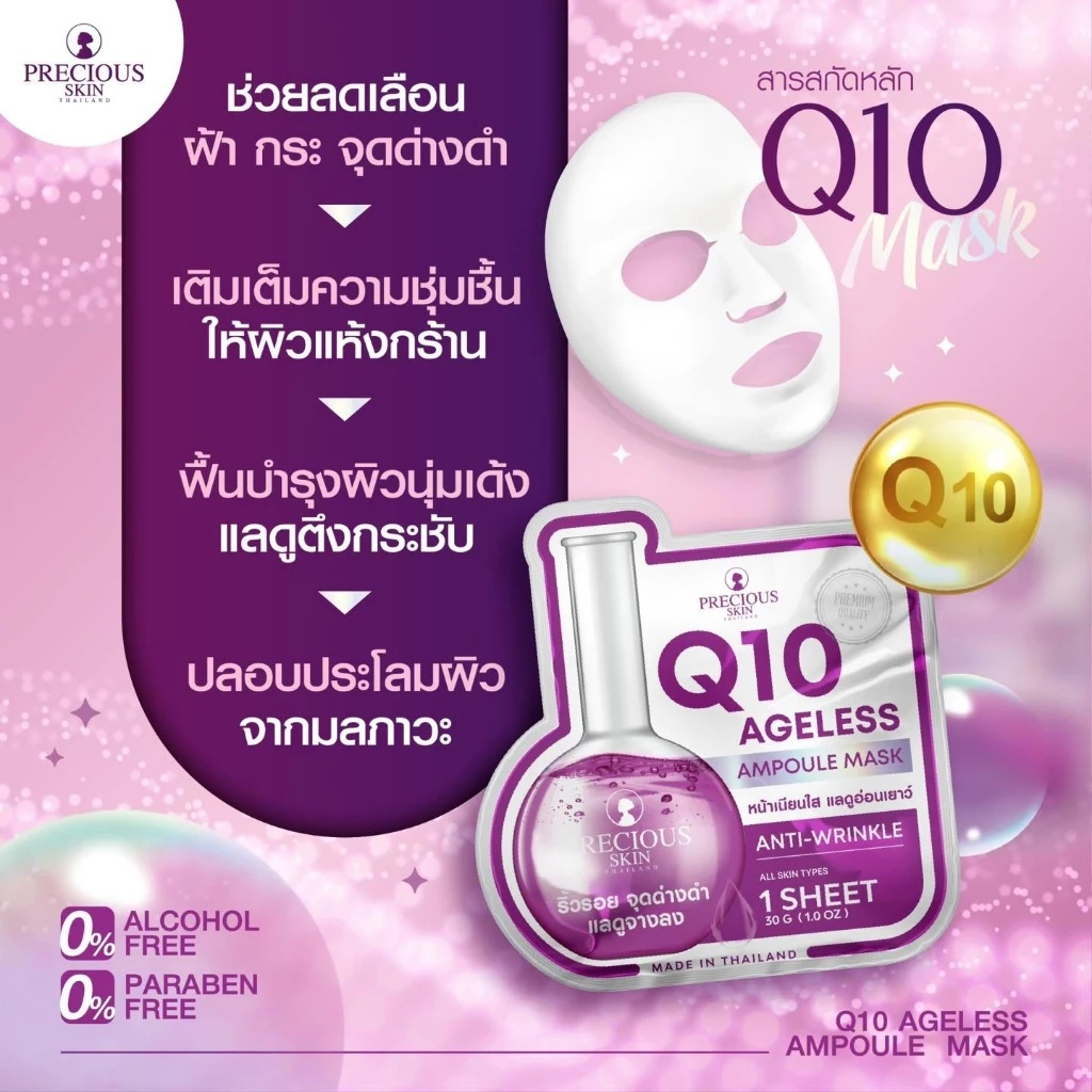 (กล่อง 10 ซอง) Precious Skin Thailand สูตร Q10 Ageless (สีม่วง) แผ่นมาส์กหน้า (ปริมาณ 30 กรัม)