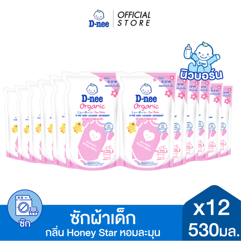 [ยกลัง] D-nee ดีนี่ ผลิตภัณฑ์ซักผ้าเด็ก Organic New Born กลิ่น Honey Star ถุงเติม 530 มล.x12 , สีชมพู