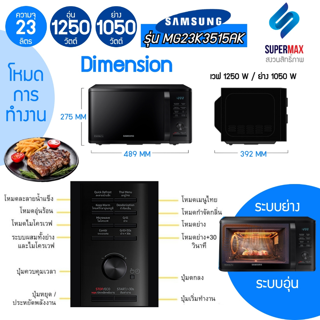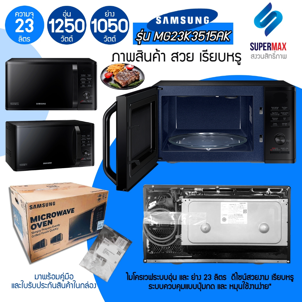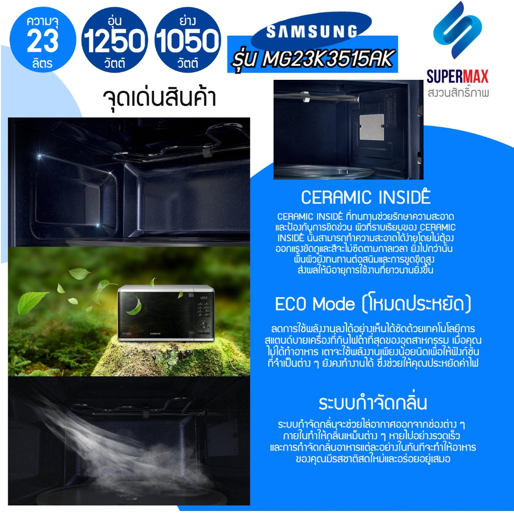 SAMSUNG เตาอบไมโครเวฟ 2 ระบบ อุ่นและย่าง รุ่น MG23K3515AK/ST 23 ลิตร ผิวเคลือบ Ceramic Enamel ทนต่อการขีดข่วน รับประกันส