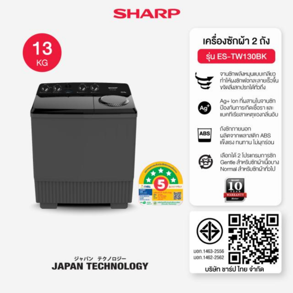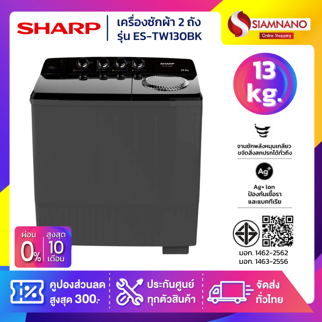 เครื่องซักผ้า 2 ถัง SHARP รุ่น ES-TW130BK ขนาด 13 Kg./7.5Kg. ( รับประกันนาน 10 ปี )