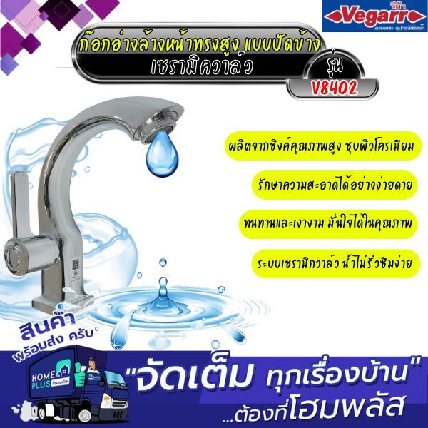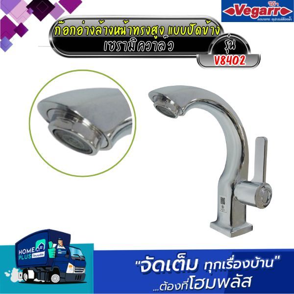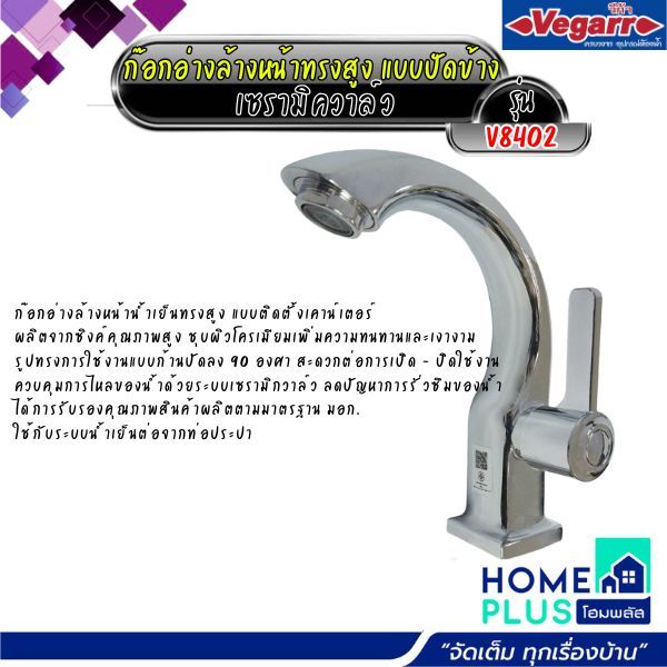 VEGARR ก๊อกอ่างล้างหน้าทรงสูง แบบปัดข้าง เซรามิควาล์ว V8402
