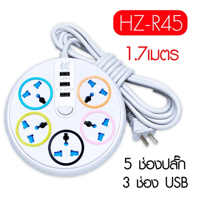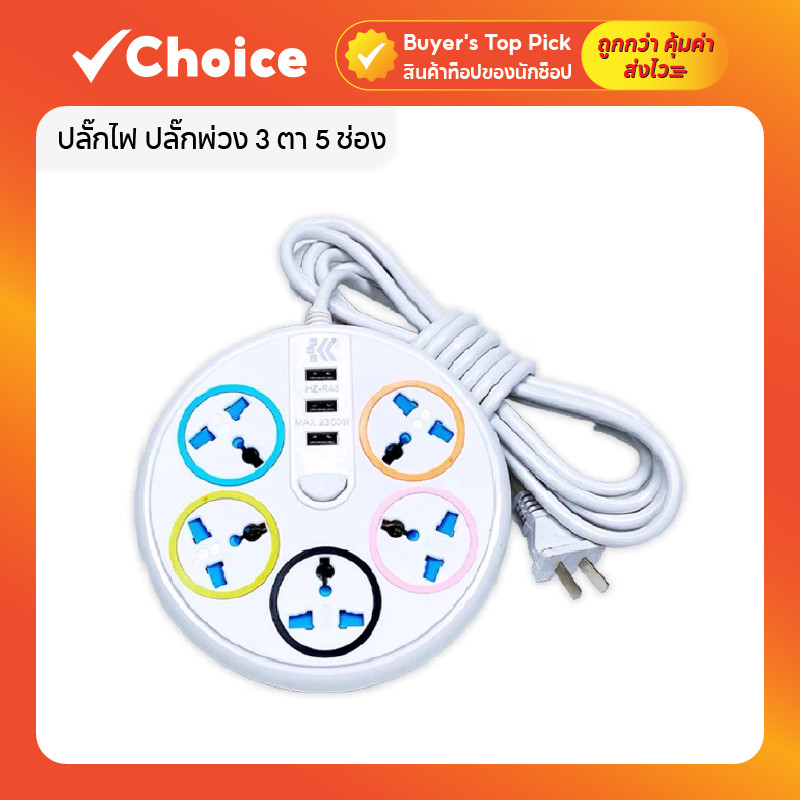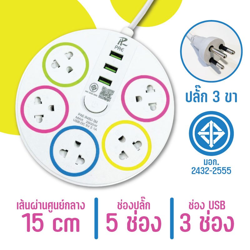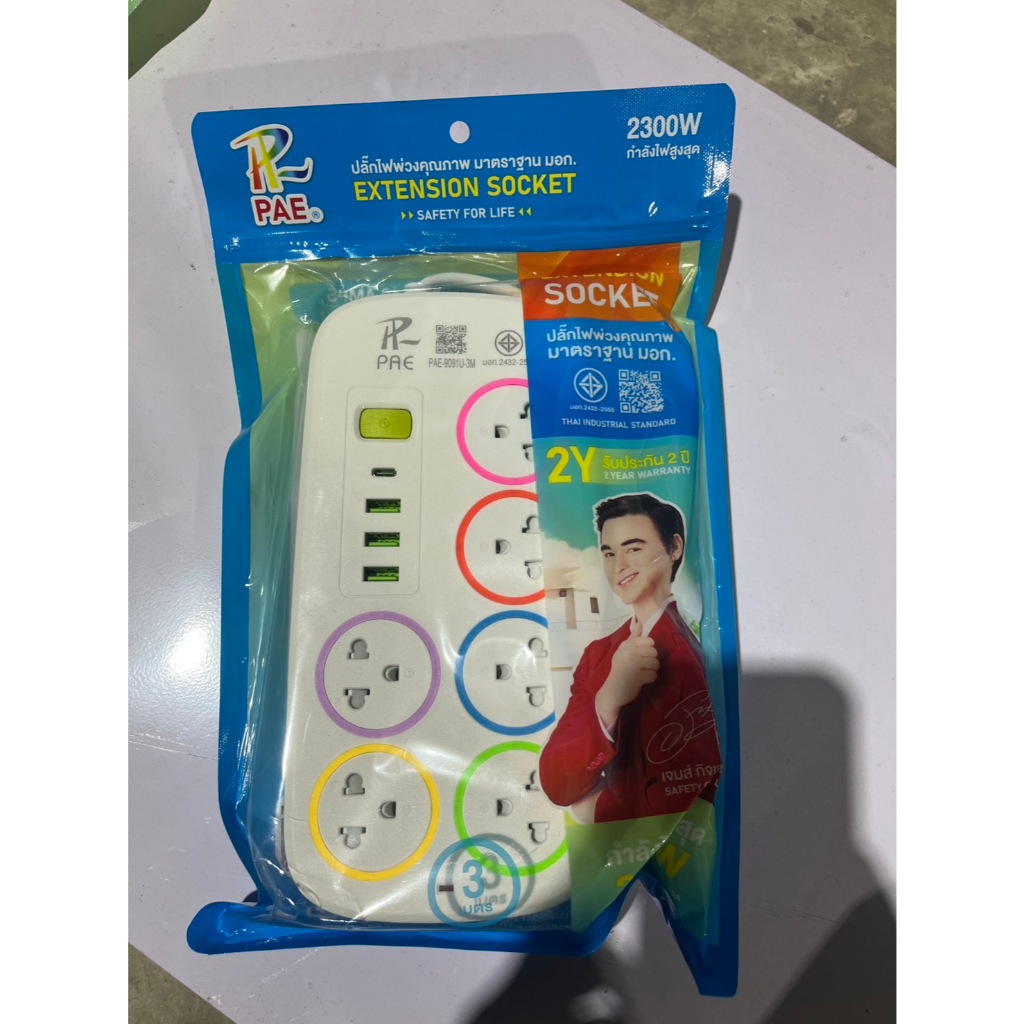 ปลั๊กไฟ มอก ปลั๊กพ่วง 5 ช่อง 3 ตา 2300W พร้อมหัวชาร์จ USB สวิตช์เปิด-ปิด ปลอดภัย ทนทาน
