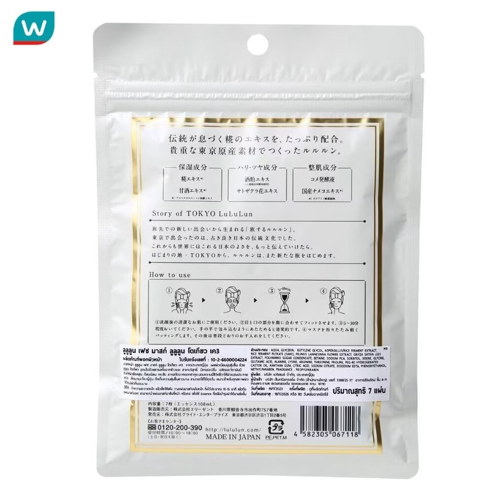 Lululun ลูลูลูน เฟซ มาสก์ ลูลูลูน โตเกียว เค3 7 แผ่น ผิวนุ่มชุ่มชื้น เรียบเนียน อิ่มน้ำ