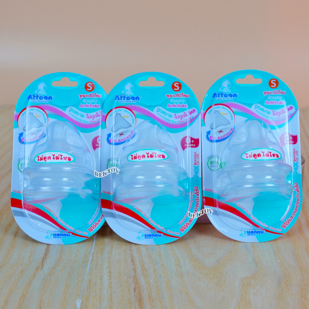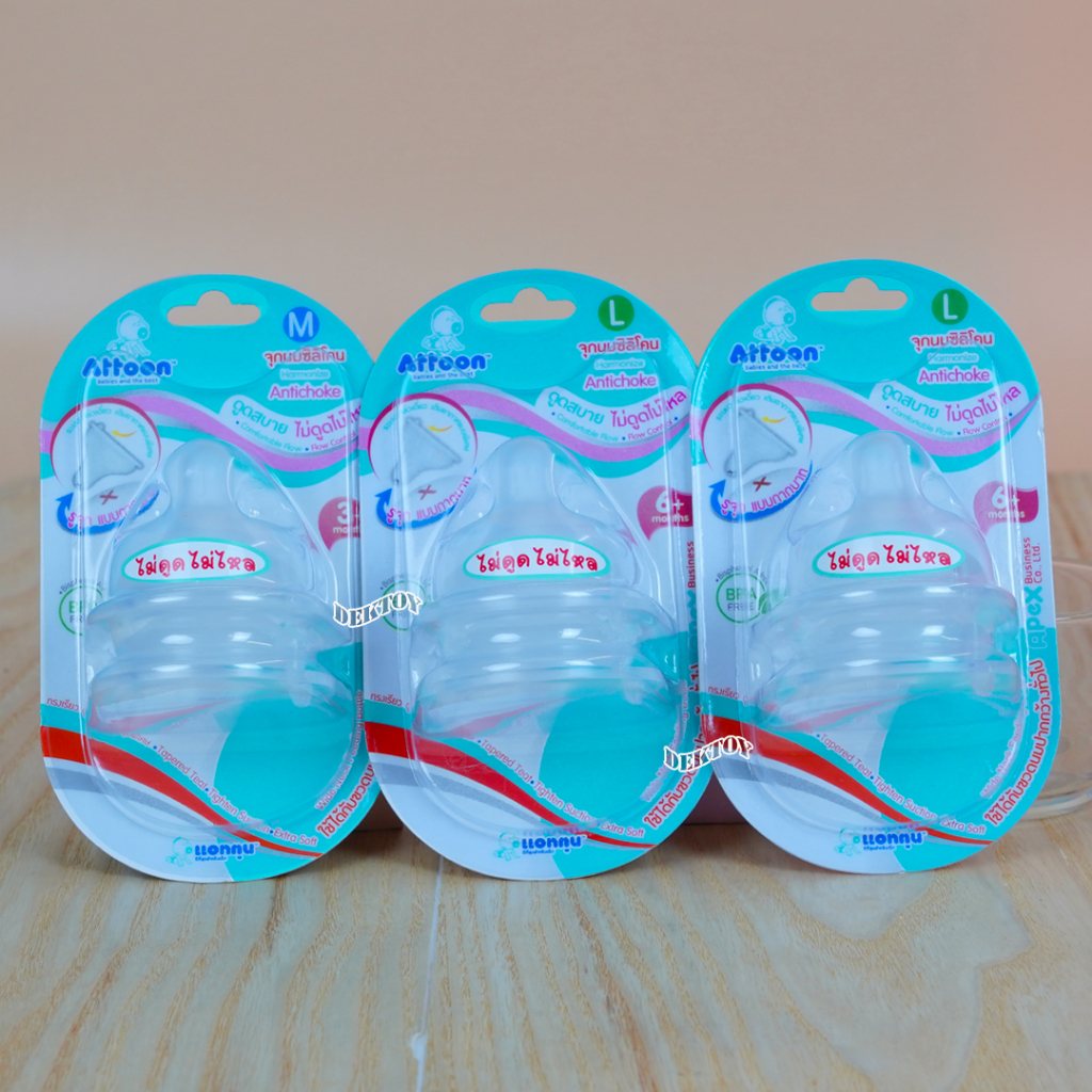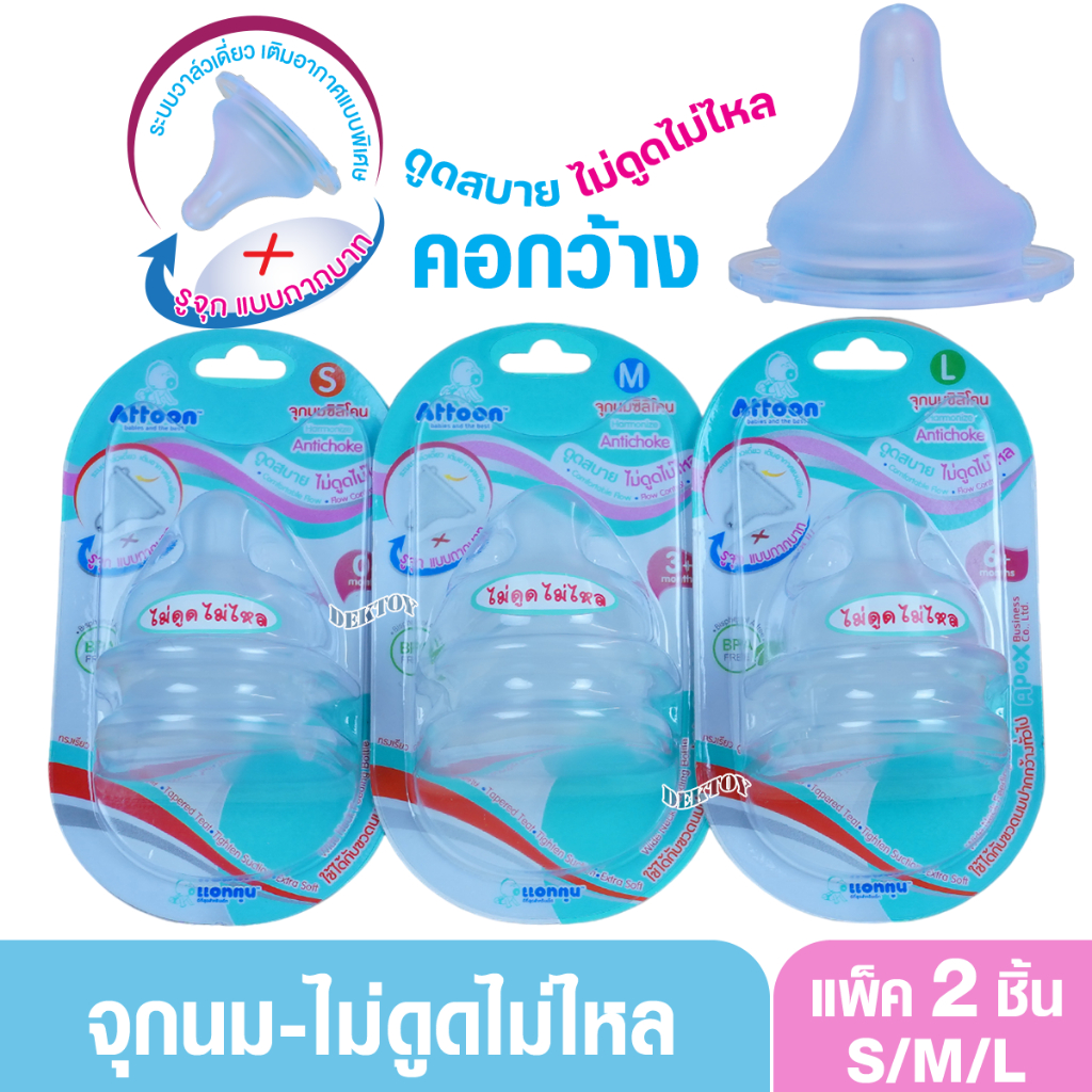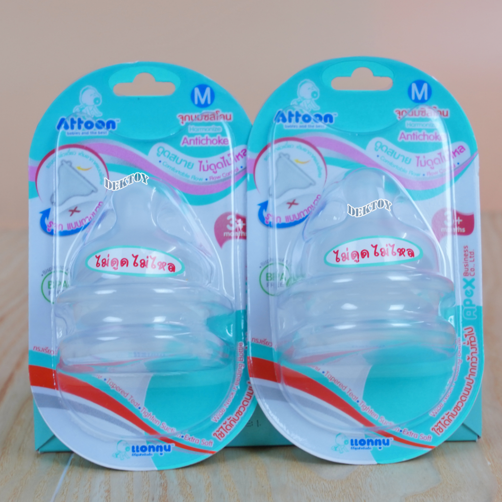 คอกว้าง จุกนมไม่ดูดไม่ไหลคอกว้าง Attoon แอทตูน จุกนุ่ม จุกนมคอกว้างรูจุกแบบกากบาทX แพ็ค2ชิ้น