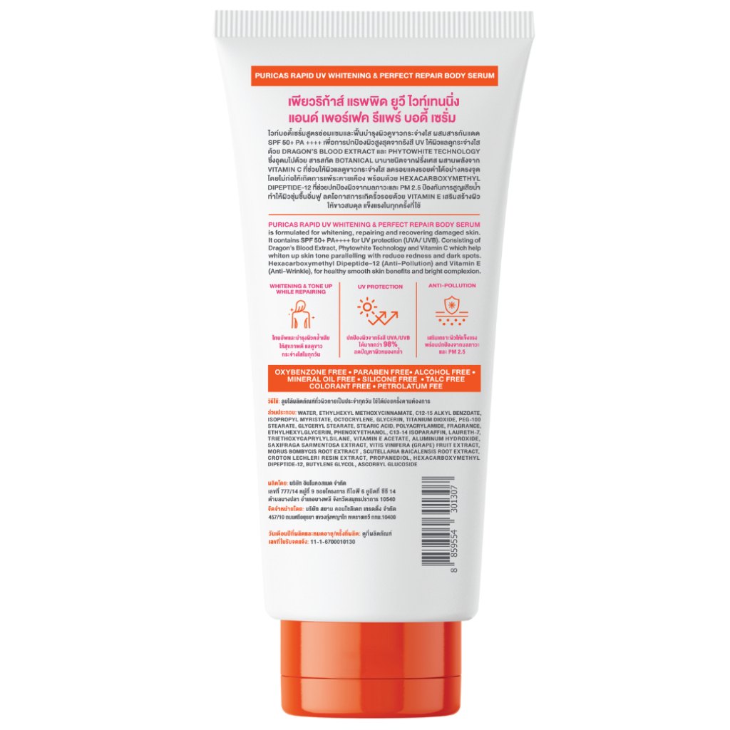 [สูตรใหม่ กันน้ำ] Puricas rapid uv whitening & perfect repair body serum 180ml. เซรั่มกันแดดผิวกาย