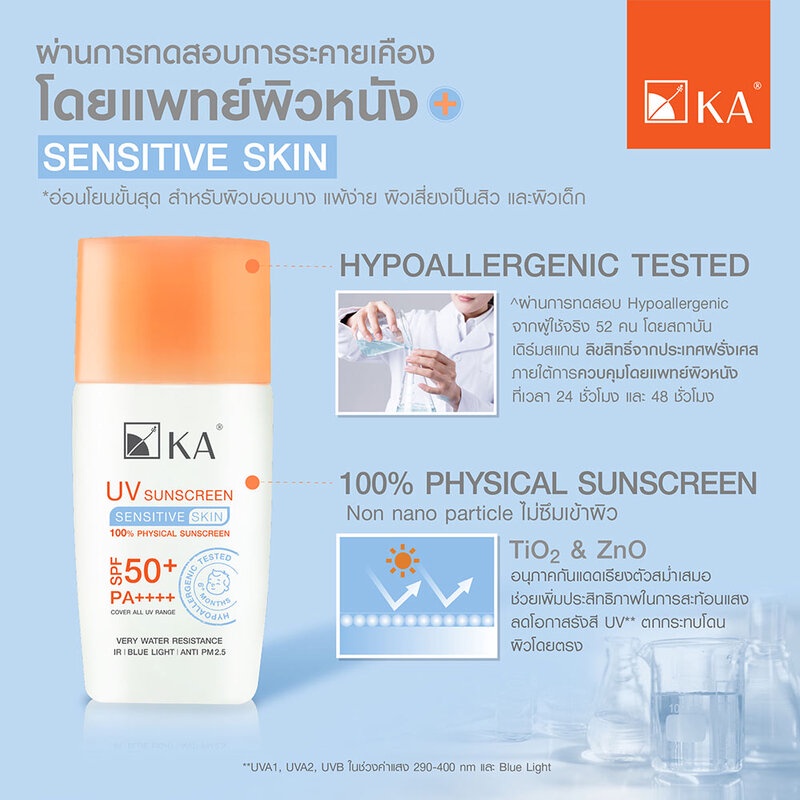 KA UV Sunscreen Sensitive Skin SPF50+ PA++++ 30ml เคเอ กันแดดชนิดฟิสิคอล 100% สูตรกันน้ำระดับสูงสุด.