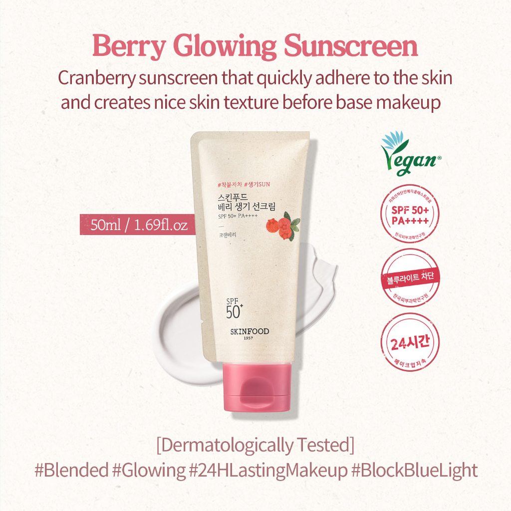 [SKINFOOD Official] ครีมกันแดดเบอร์รีสูตรผิวโกลว์ 50ml SPF 50+ PA++++ กันแดดที่ผสม Moisturizer เพิ่มความโกลว์ให้ผิว ลดริ ้วรอย ป้องกัน UV & Blue Light ติดทนบน makeup ยาวนานถึง 24ชม. Berry Glowing Hybrid Sunscreen