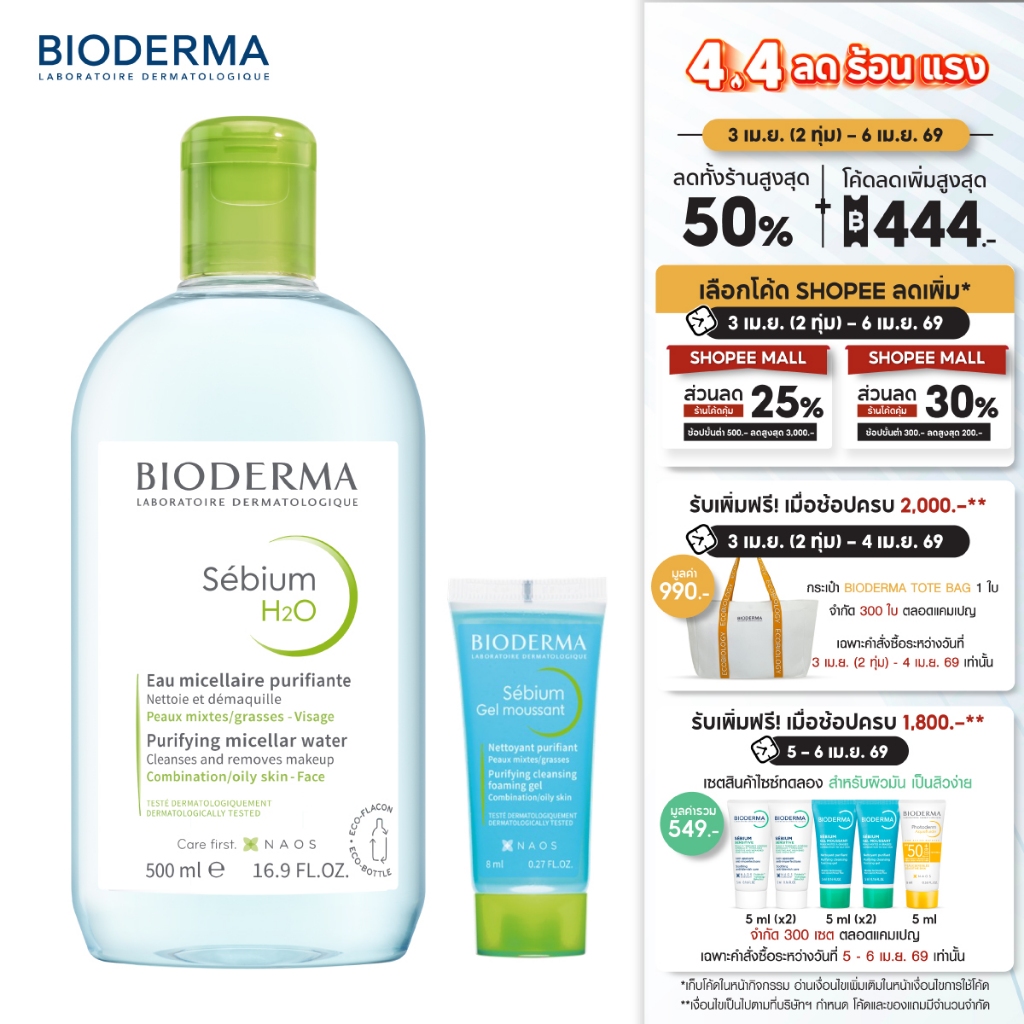 Bioderma Sebium H2O 500 ml + Sebium Gel Moussant 8 ml คลีนซิ่งและเจลล้างหน้าสำหรับผิวมัน เป็นสิวง่าย