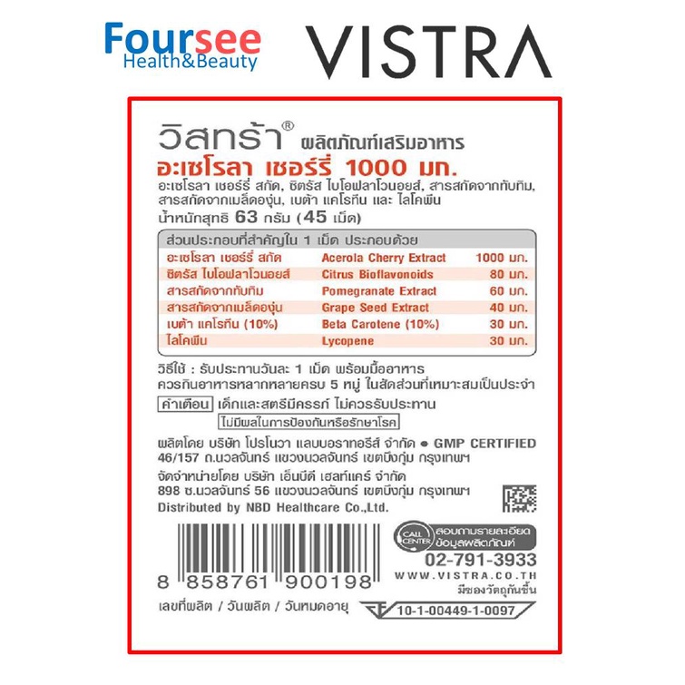 ((แพ็ค2คุ้มกว่า)) vistra acerola cherry 1000 mg 45 เม็ด วิสทร้า อะเซโรลา เชอร์รี่