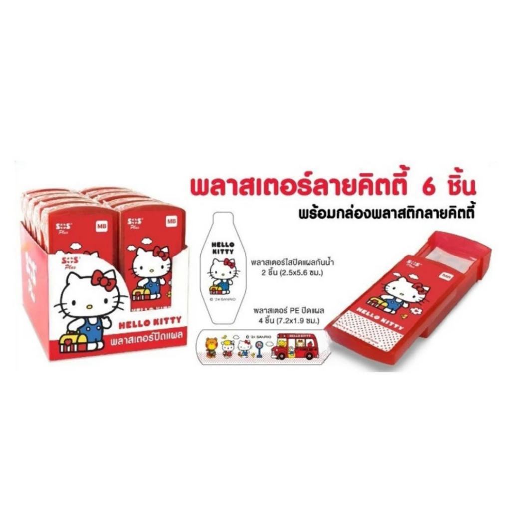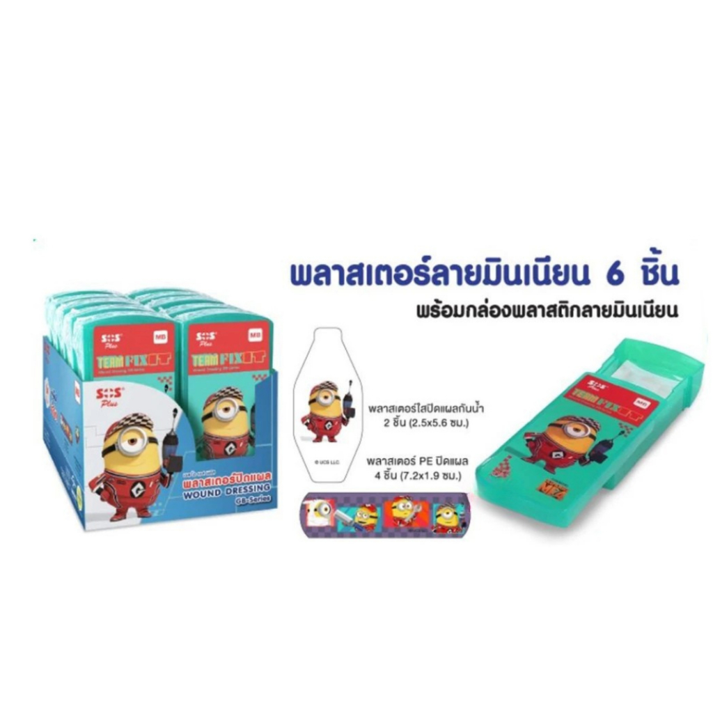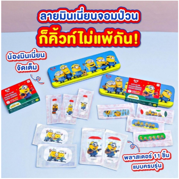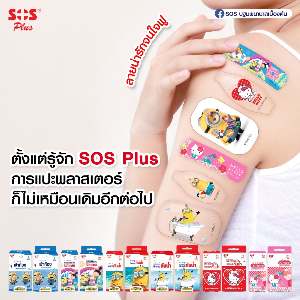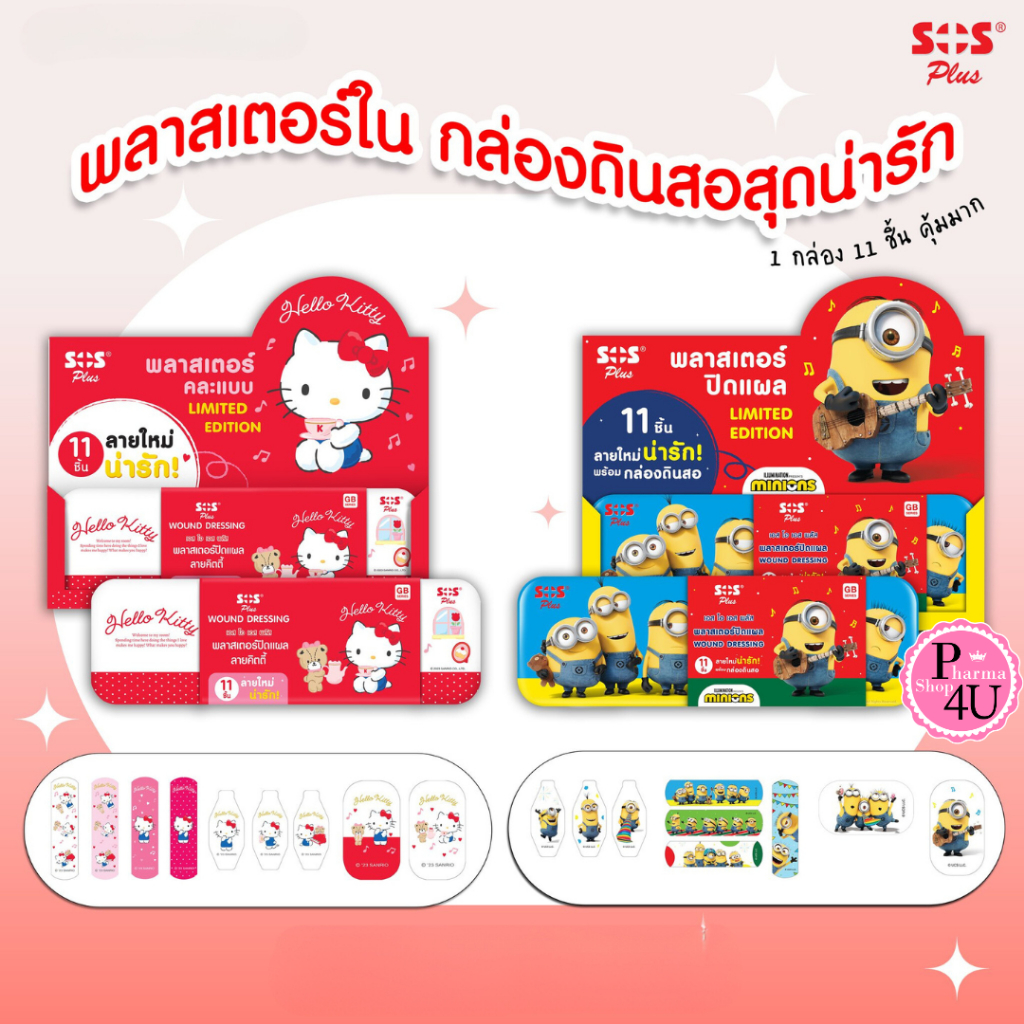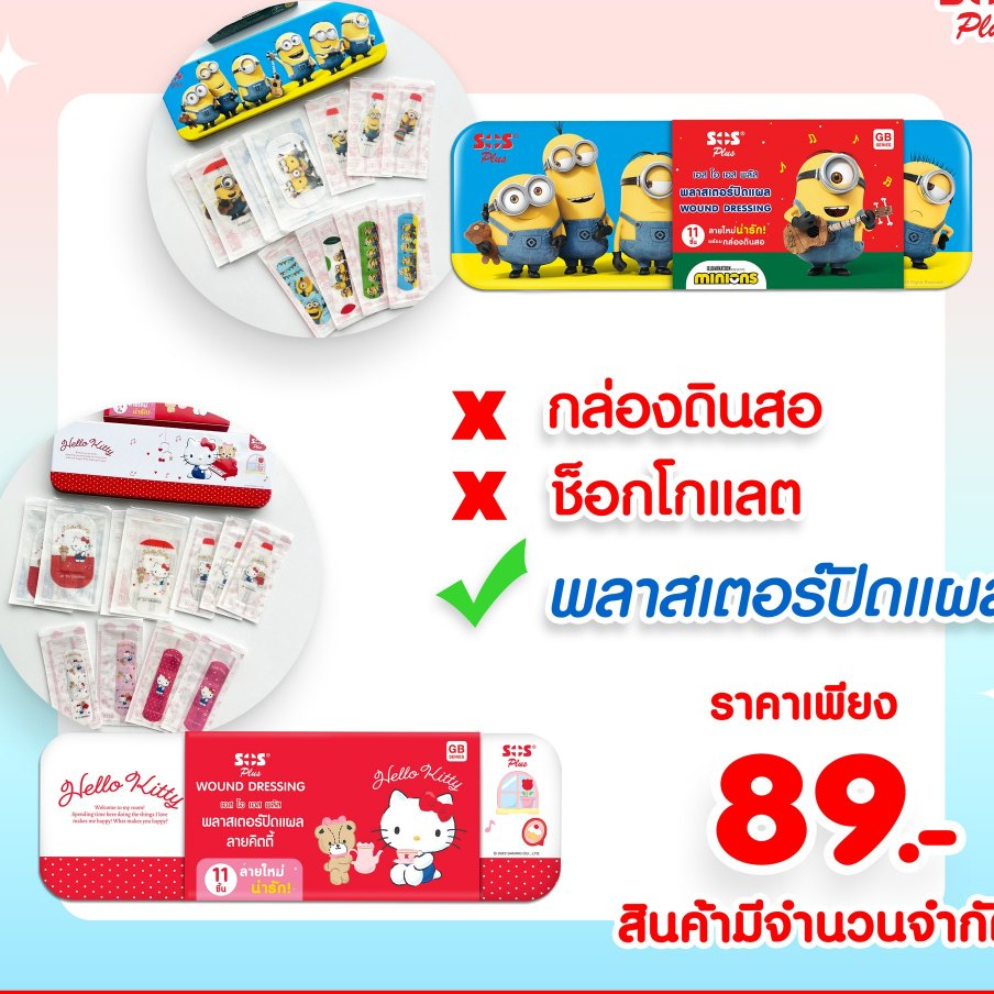SOS Plus พลาสเตอร์ปิดแผล กันน้ำ คละแบบ 11 ชิ้น แถมกล่องดินสอ ลายคิตตี้ มินเนี่ยน