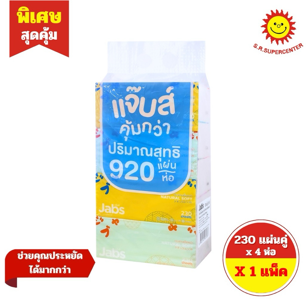 [ 1 แพ็ค ] Jabs แจ๊บส์ กระดาษเช็ดหน้า เนเจอรัลซอฟท์ 230แผ่น x4ห่อ