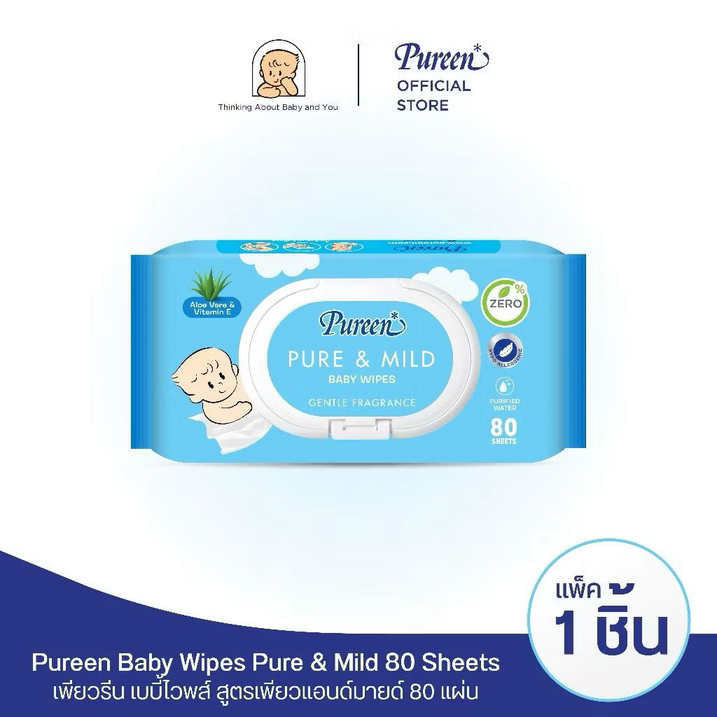 ทิชชู่เปียกเช็ดทำความสะอาดผิว 80แผ่น/เพียวรีน เบบี้ไวพ์ สูตรเซ็นซิทีฟ 80 ชิ้น สีชมพู แพ็ค 1