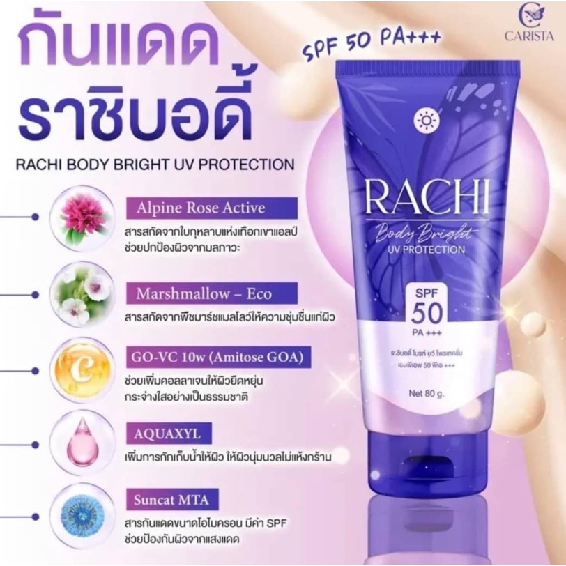 (80ml/หลอด) RACHI BODY UV PROTECTION SPF50 PA+++ ราชิ บอดี้ ไบร์ท ยูวีโพรเทคชั่น กันแดดทาตัว [2620]