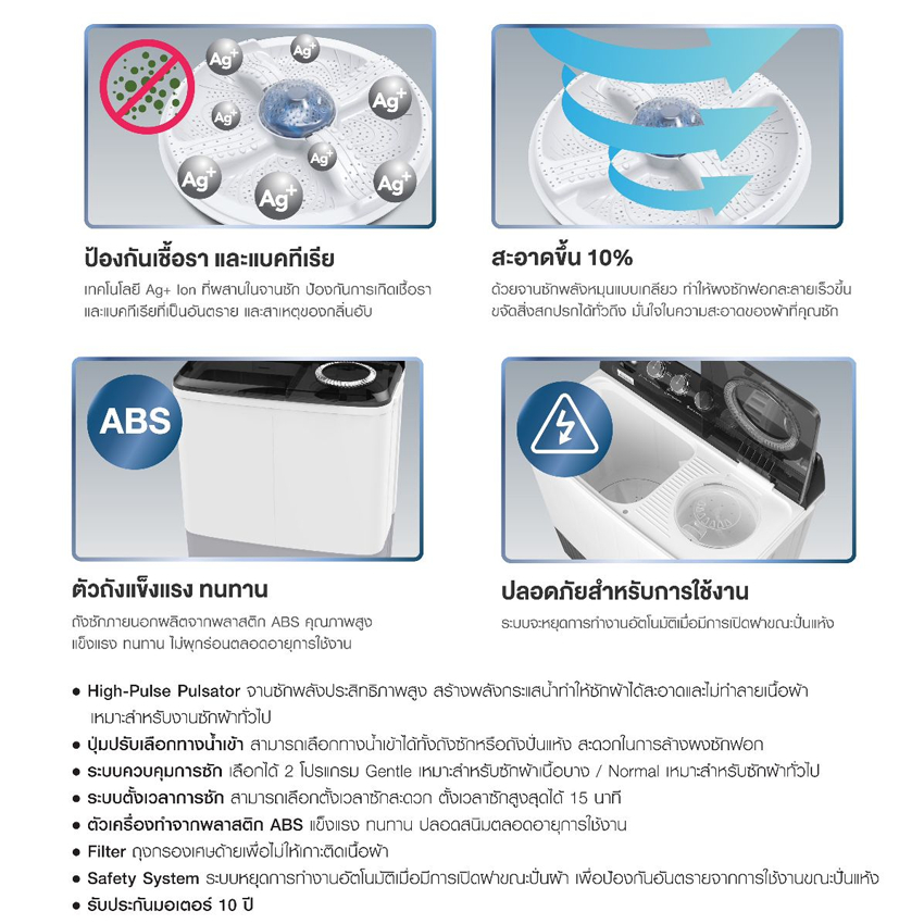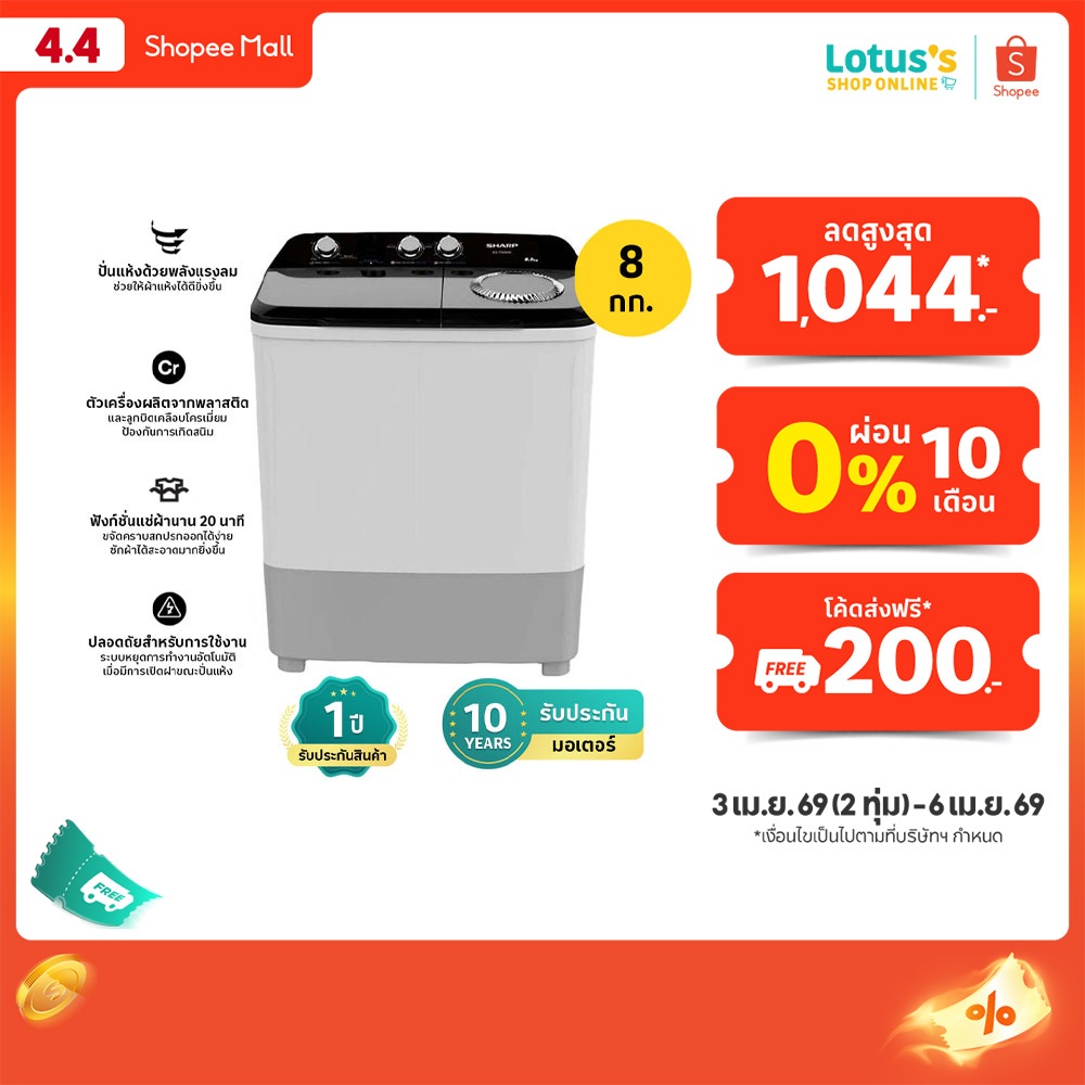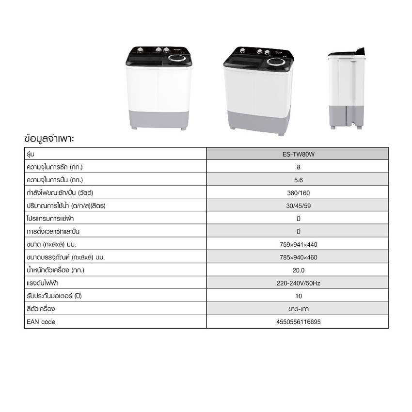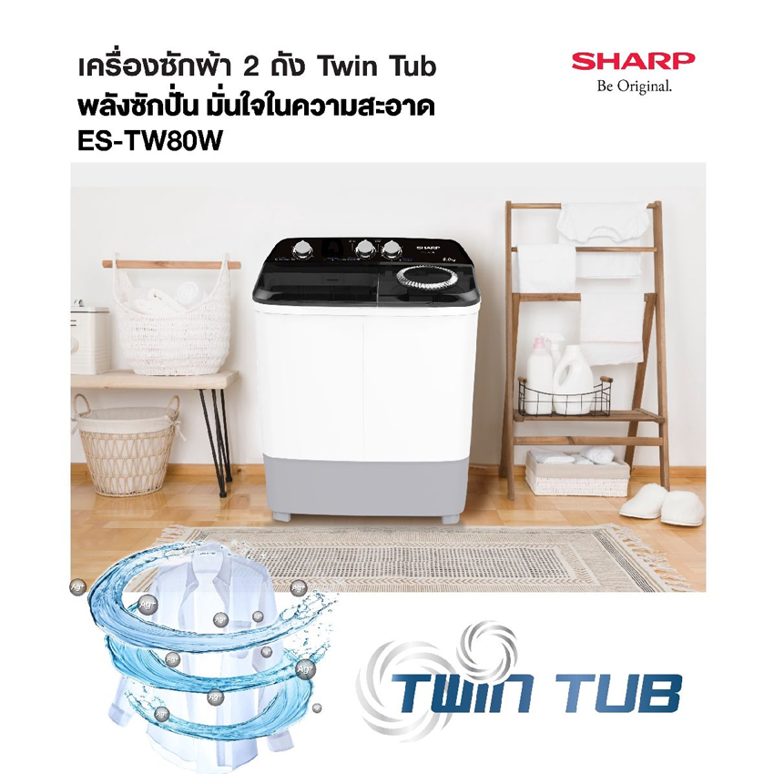 ชาร์ป เครื่องซักผ้า 2 ถัง ขนาด 8 กิโลกรัม รุ่น ES-TW 80วัตต์ สีดำ SHARP WASHING TWINTUB 8KG ES-TW80W.